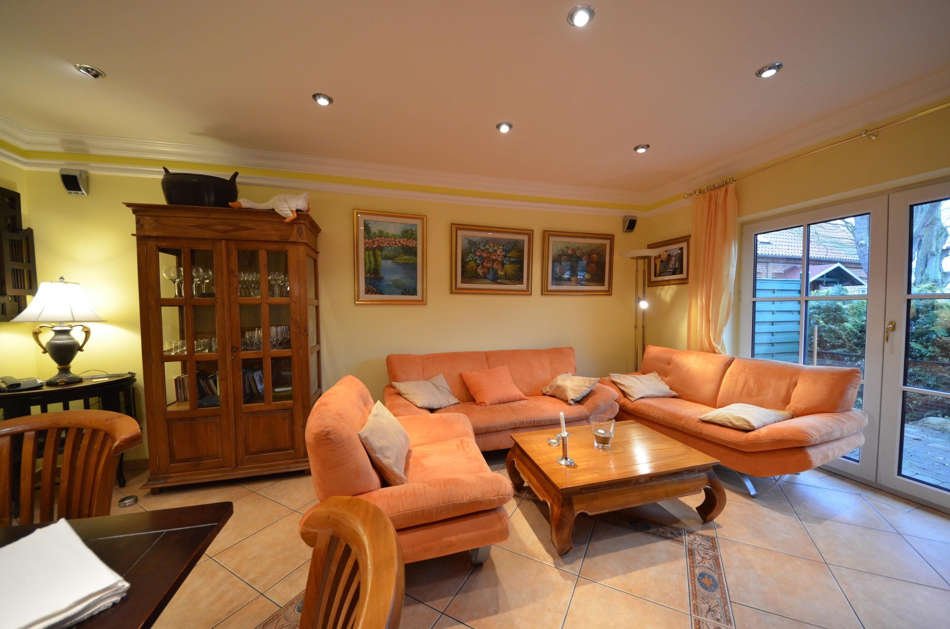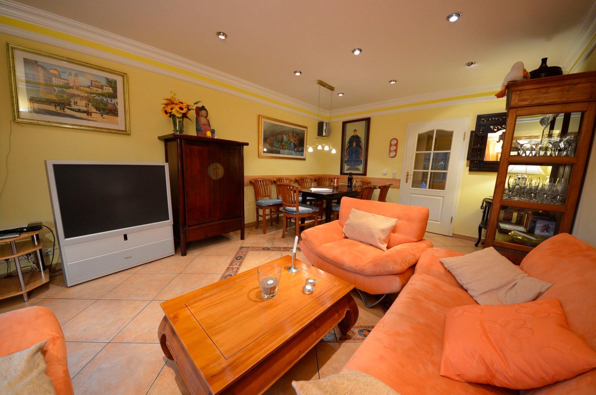 mit Fußbodenheizung schöne Couch-Garnitur mit Opiumtisch, Esstisch m. Stühlen Geschirrschrank, Sat - TV mit ca. 40 Programmen, Video -Recorder, Stereoanlage, CD - Player, Telefontisch mit Telefon und balinesischem Spiegel pp. Kinderhochstuhl, Wände dekoriert mit Bildern, Terrasse mit Gartenmöbeln.