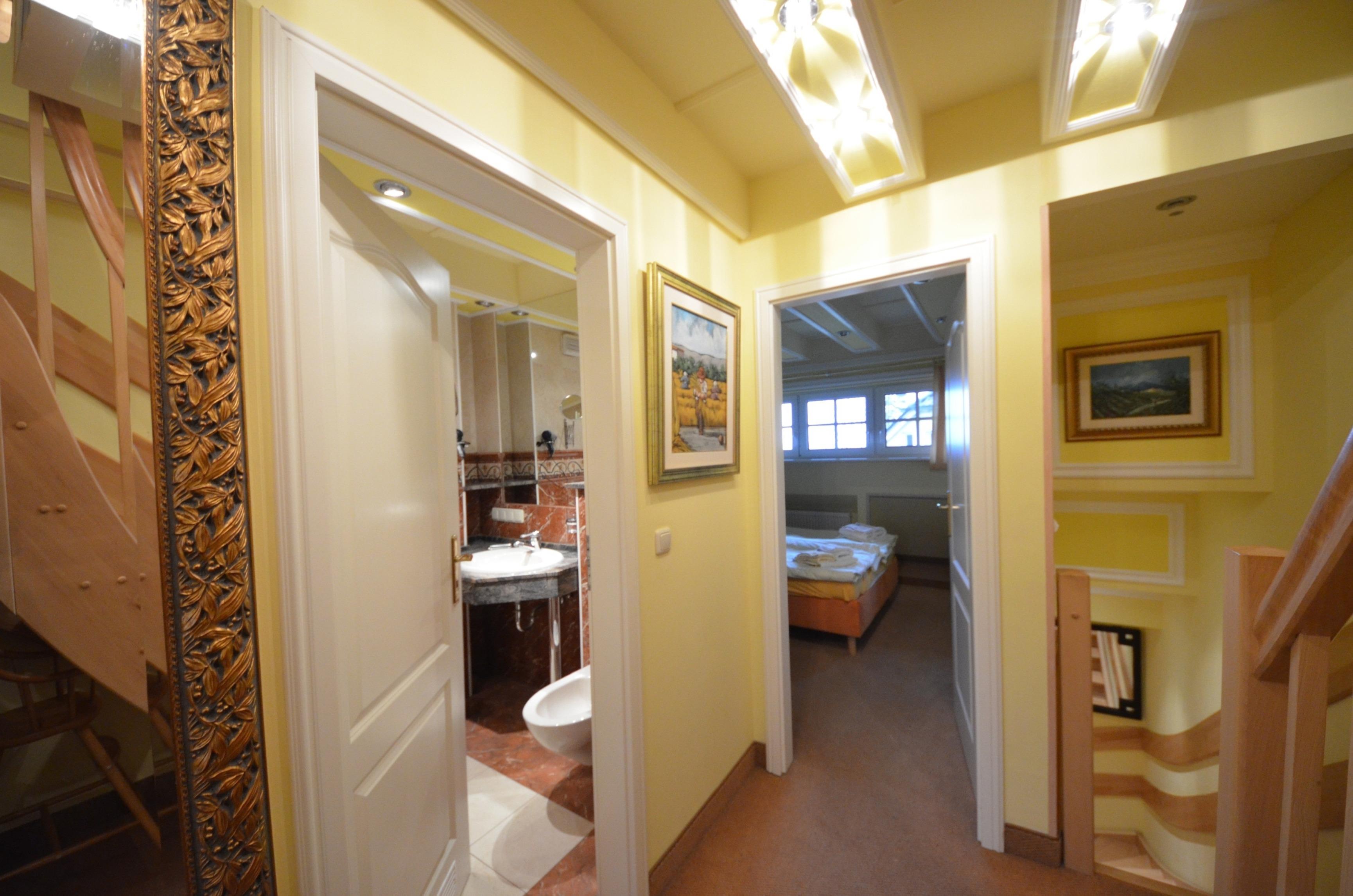 Zweites Badezimmer mit Fußbodenheizung, Naturstein-Abdeckungen, große Spiegel, schöne Sanitärausstattung, Einbau Waschbecken mit Granit - Abdeckungen, beheizbarer Handtuchhalter, Fön, Schminkspiegel, Dusche in der Wanne mit Dusch-Trennwand.