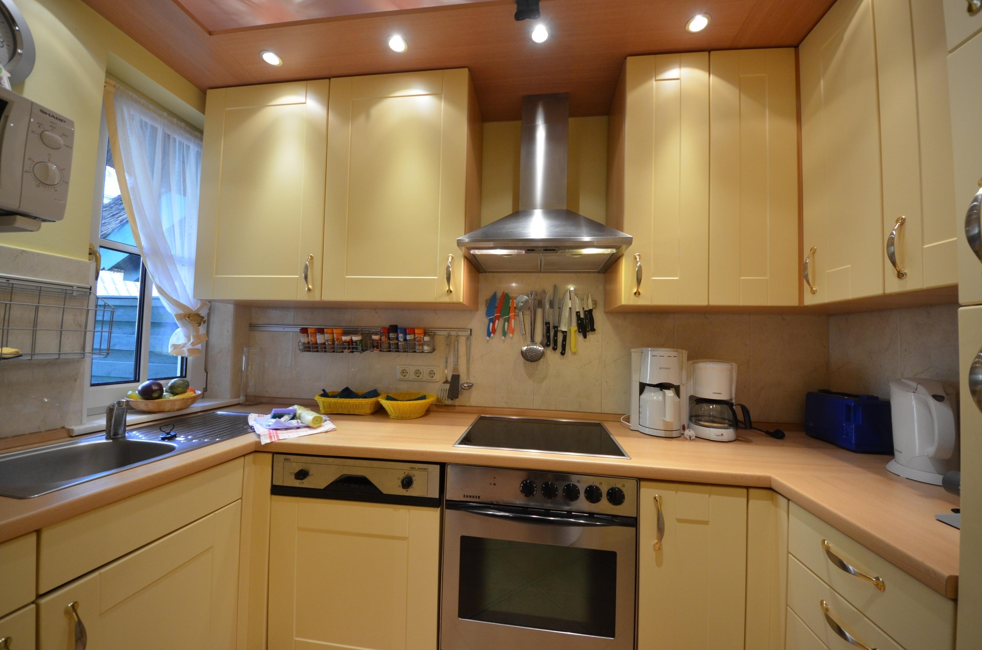 Fußbodenheizung, moderne Einbauküche in arktisgelb, Geschirrspüler, Mikrowelle, Herd mit Ceran -Kochfeld und Backofen, Kühlschrank mit Gefrierteil, Turmhaube, 2 Kaffeemaschinen, Wasserkocher, Eierkocher, Toaster, Waffeleisen, Mixer, ausreichend Edelstahltöpfe Schnellkochtopf Gewürze usw.