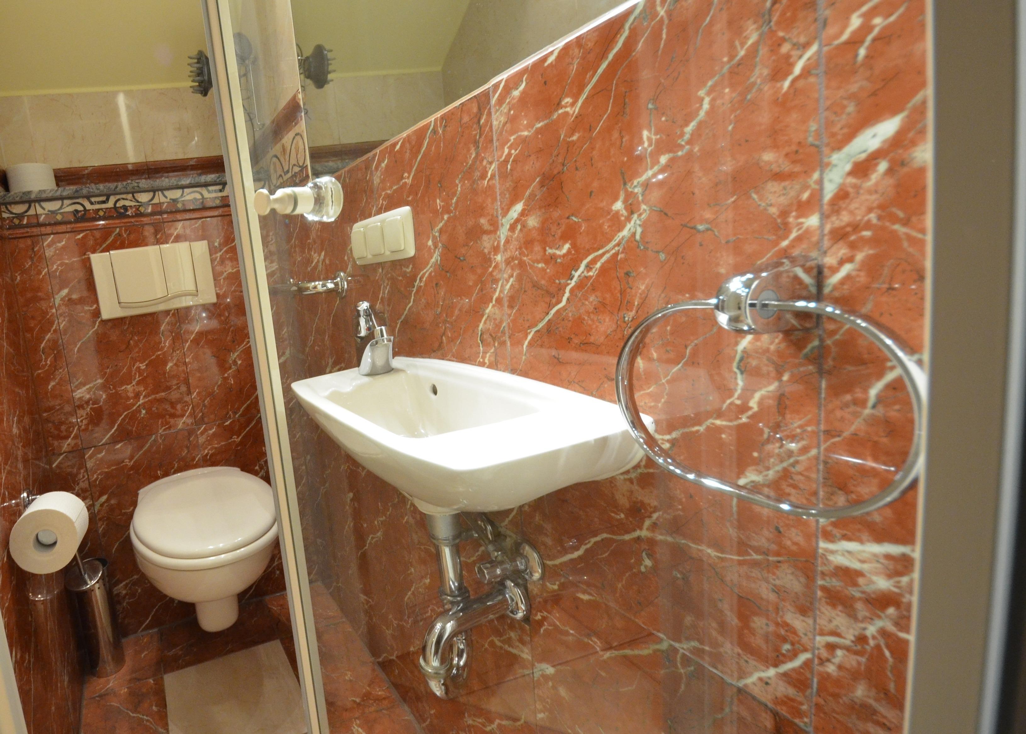Glasdusche, Toilette, Fußbodenheizung, Fön, kleines Waschbecken