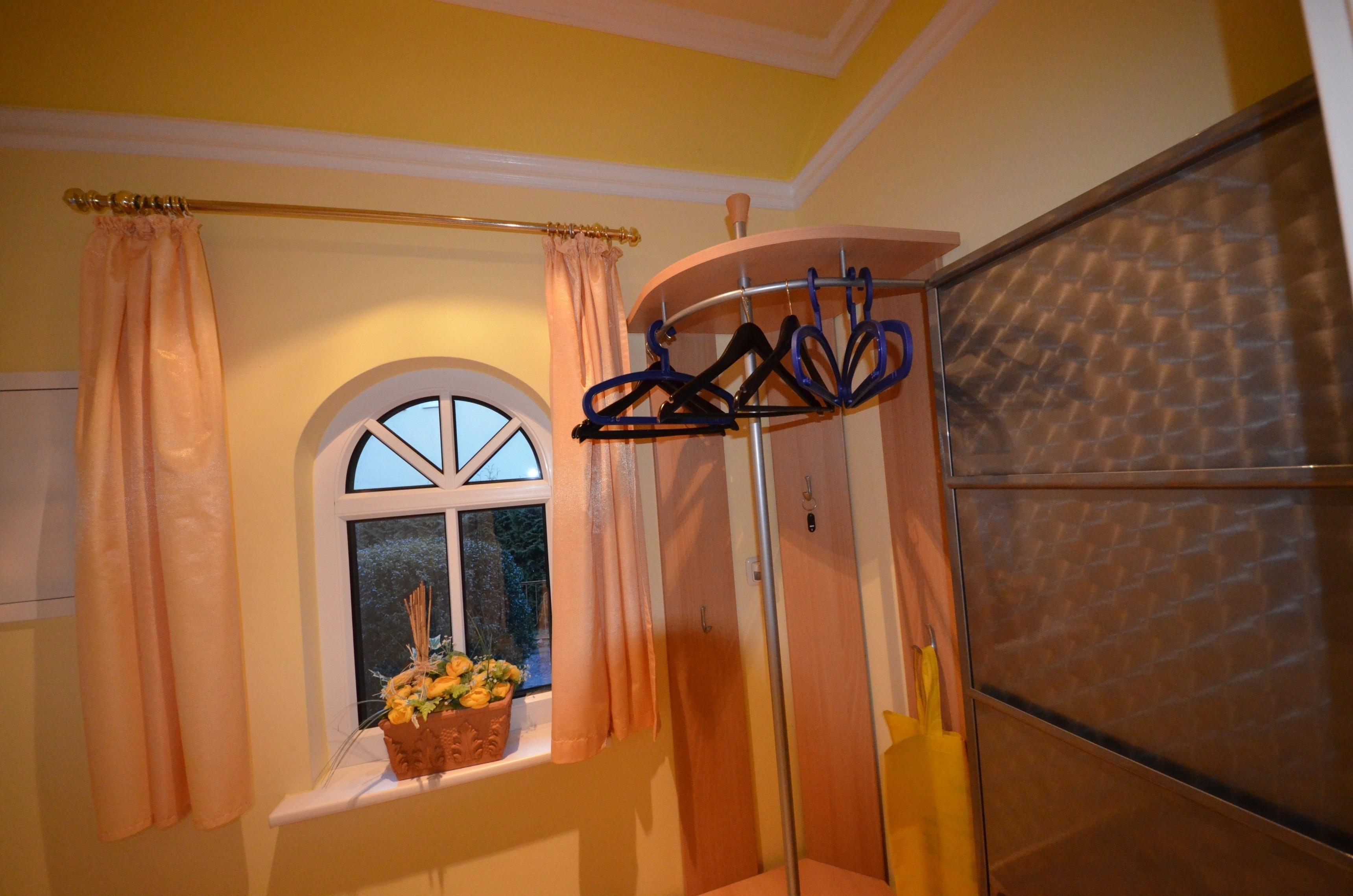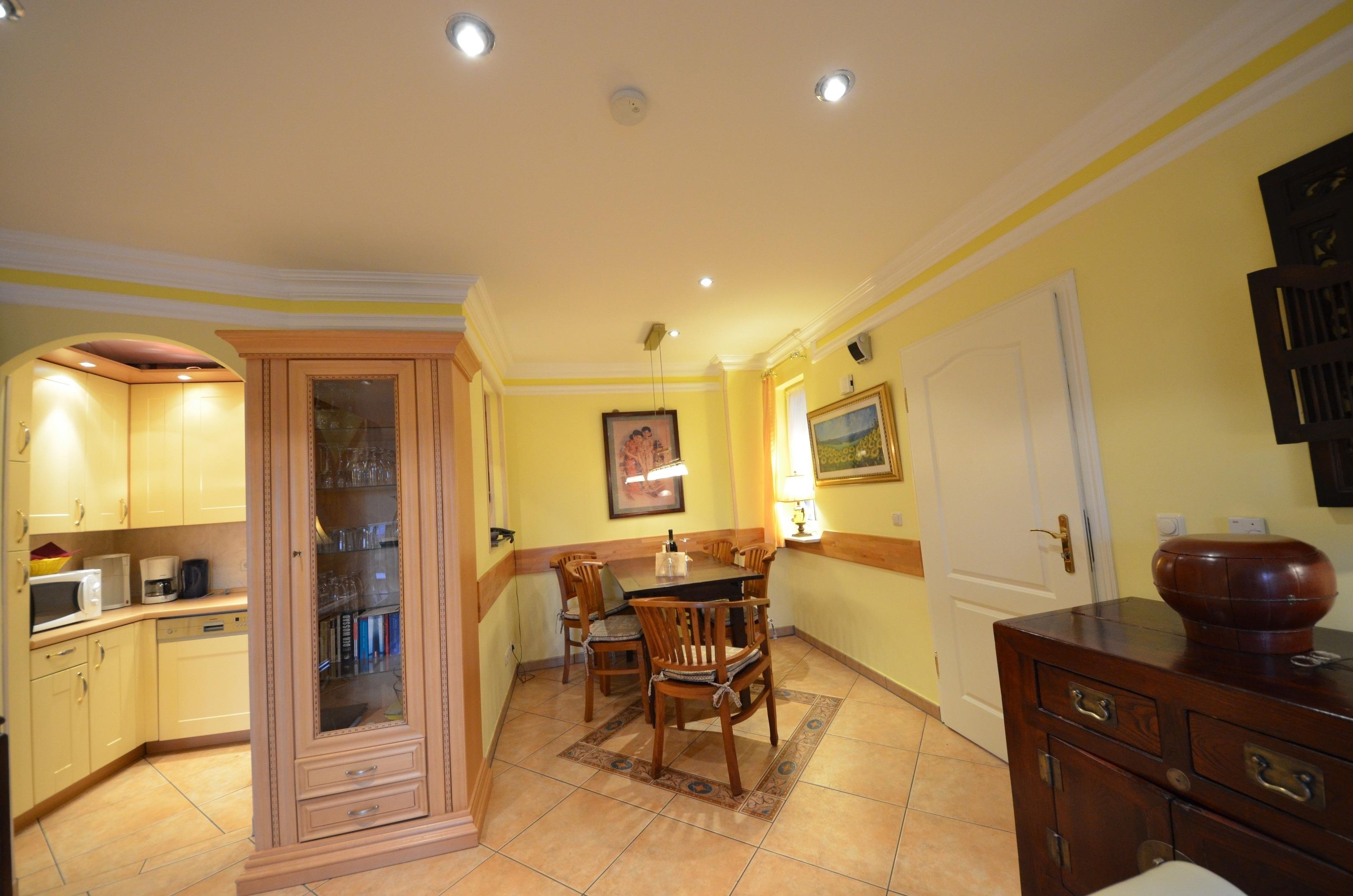 Eingangsflur mit Garderobe und Schuhschrank, Fußbodenheizung, großzügiges Wohn- Esszimmer, schöne Couchgarnitur mit Opiumtisch, Esstisch mit 5 Stühlen, Geschirrschrank, Satt - TV mit 82-106 cm! Großbild mit ca.40 Programmen, Stereoanlage, CD - Player, Telefontisch mit Telefon und balinesischem Spiegel pp.