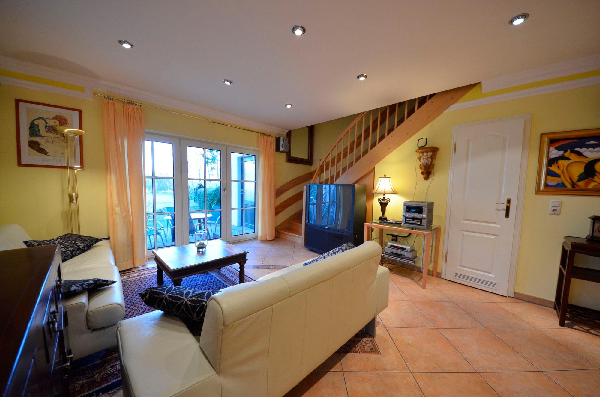 Wohnzimmer mit Eßbereich und Ausgang zur Terrasse und Garten. 1 kleines Duschbad, Abstellraum, Küche.