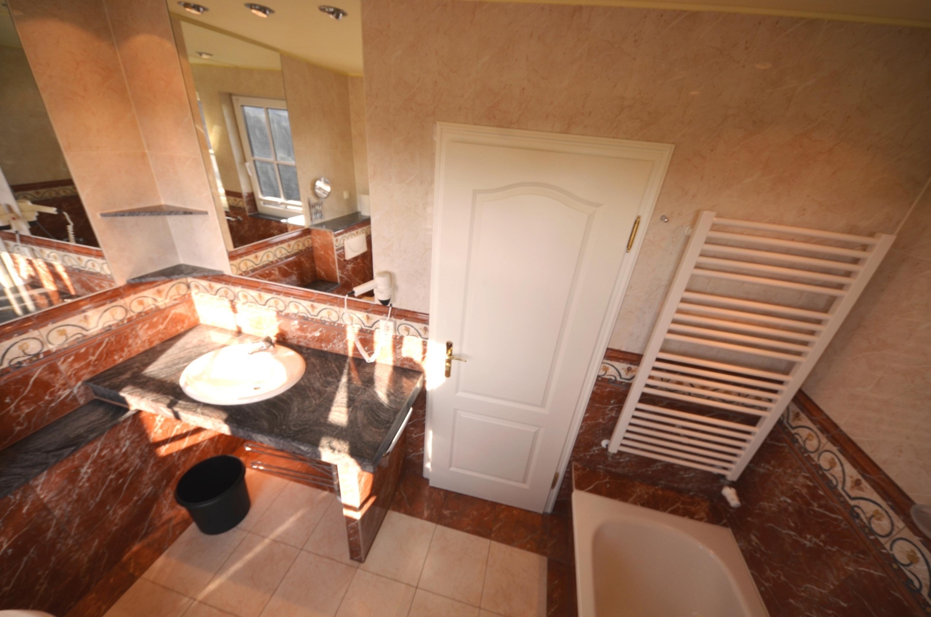 Mit 2 Fenstern. Wanne mit Dusch - Glastrennwand. Fön, Schminkspiegel, Fußbodenheizung, Natursteinabdeckungen, großflächige Spiegel, schöne Sanitärausstattung, beheizbarer Handtuchhalter.