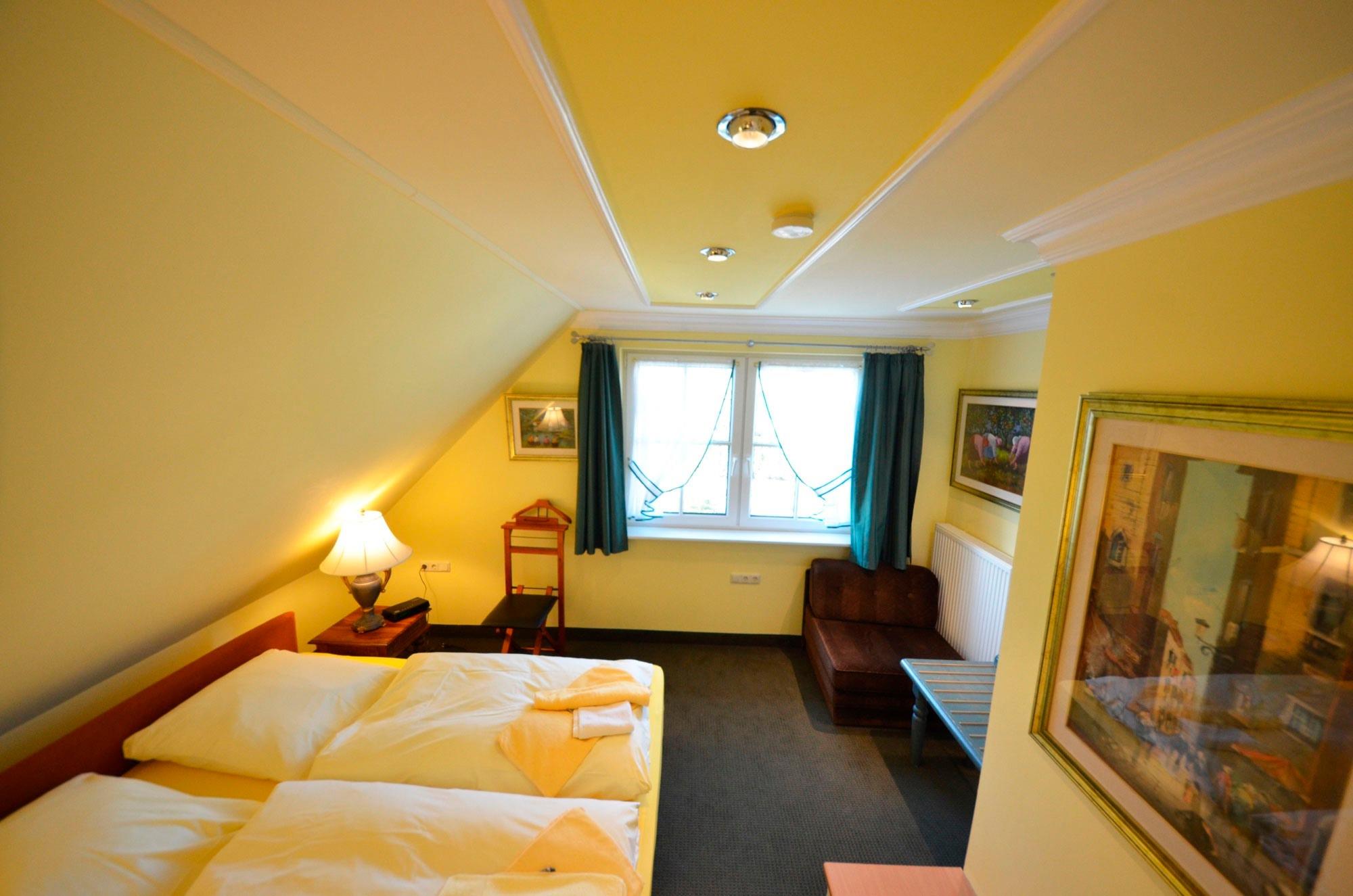 2 kleine schräge aber gemütliche und helle Einzelzimmer je mit einem Einzelbett 90 x 200cm mit aufgezogener Bettwäsche.