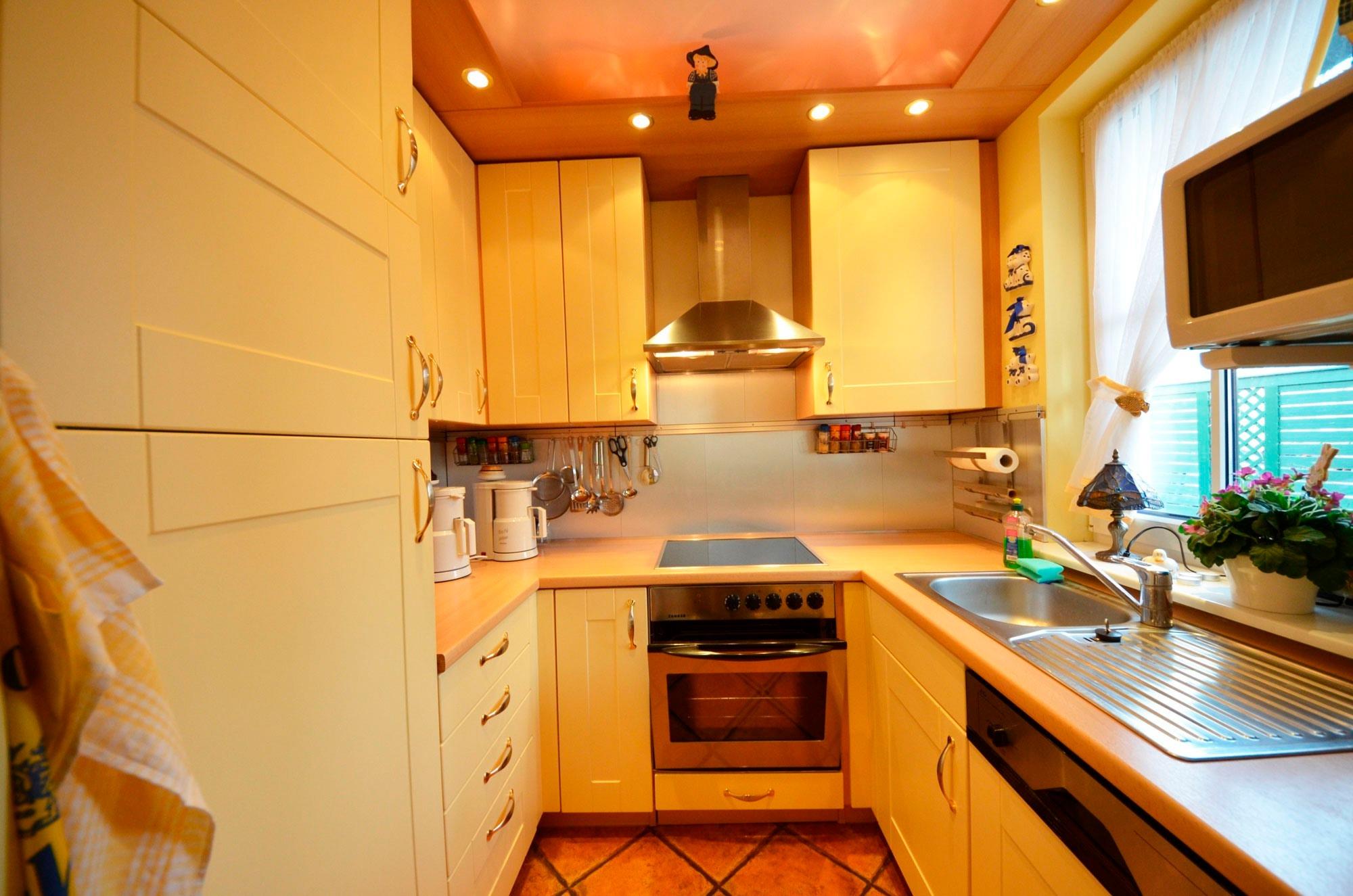 Fußbodenheizung, moderne Einbau-Landhausküche in arktisgelb, Geschirrspüler, Mikrowelle, Herd mit Ceran - Kochfeld Turmhaube und Backofen, Kühlschrank mit Gefrierteil, 2 Kaffeemaschinen, Wasserkocher, Eierkocher, Toaster, Waffeleisen, Mixer, ausreichend Edelstahl - Töpfe, Schnellkochtopf, Gewürze usw.
