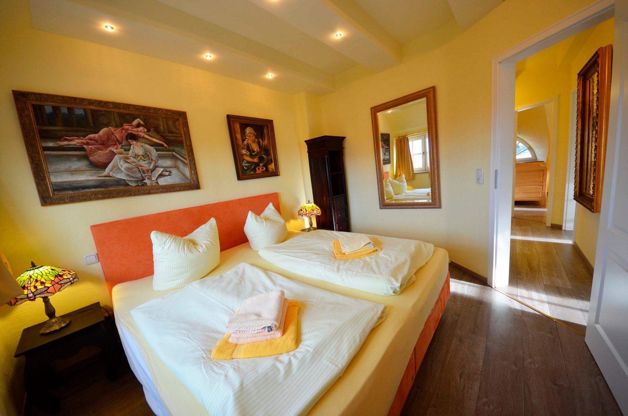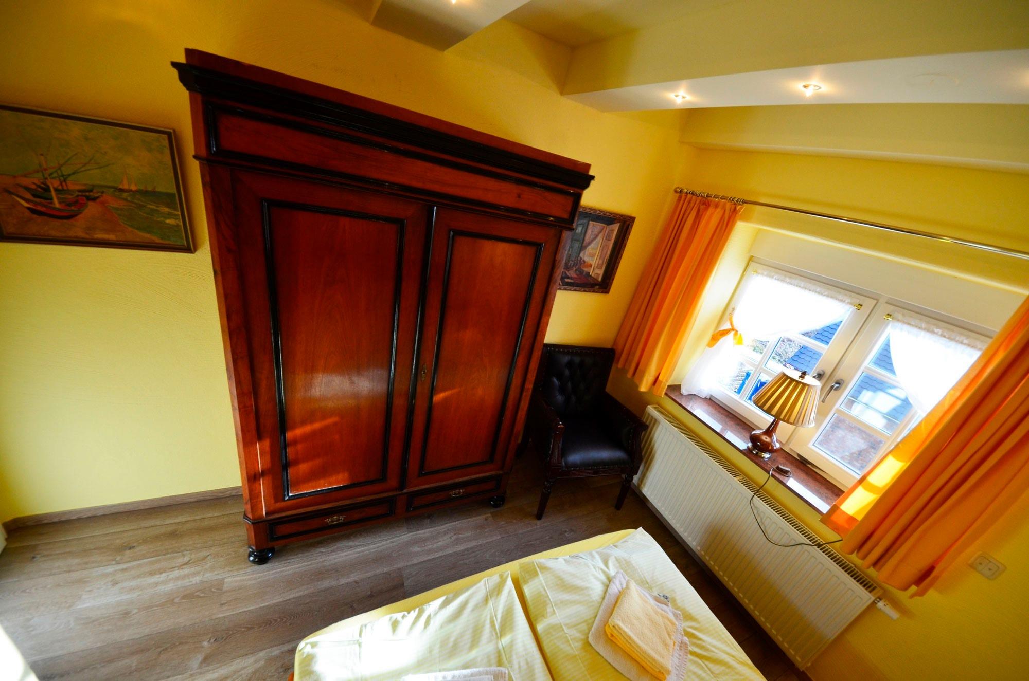 3 Doppelschlafzimmer - teilweise mit elektr. Rollläden. Doppelbetten, Radiowecker, mit Bildern dekoriert, antike Kleiderschränke, teilweise Einbauschränke, 1 weiterer TV sowie 1x kostenloses Babybett mit Babybettwäsche in einem Schlafzimmer