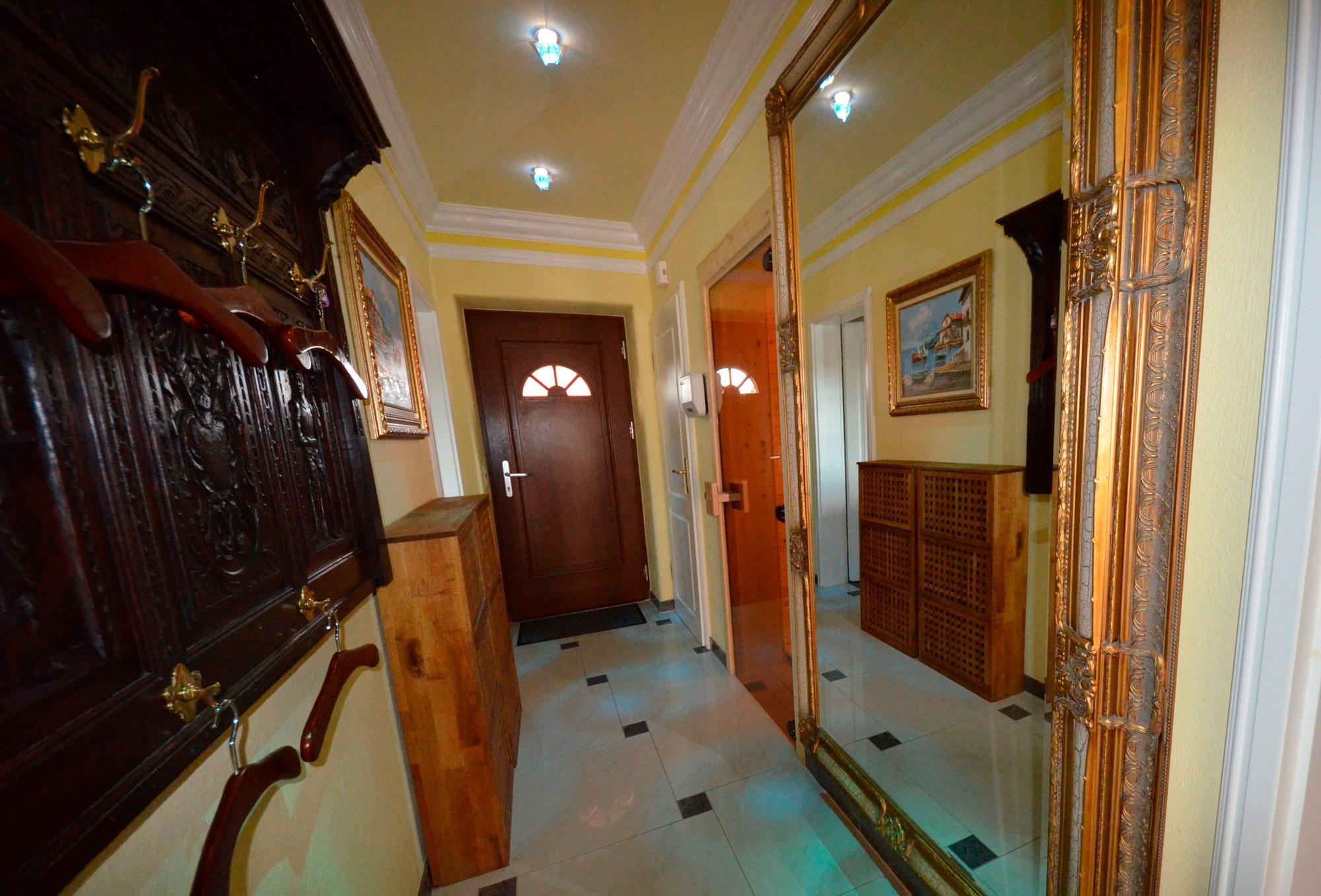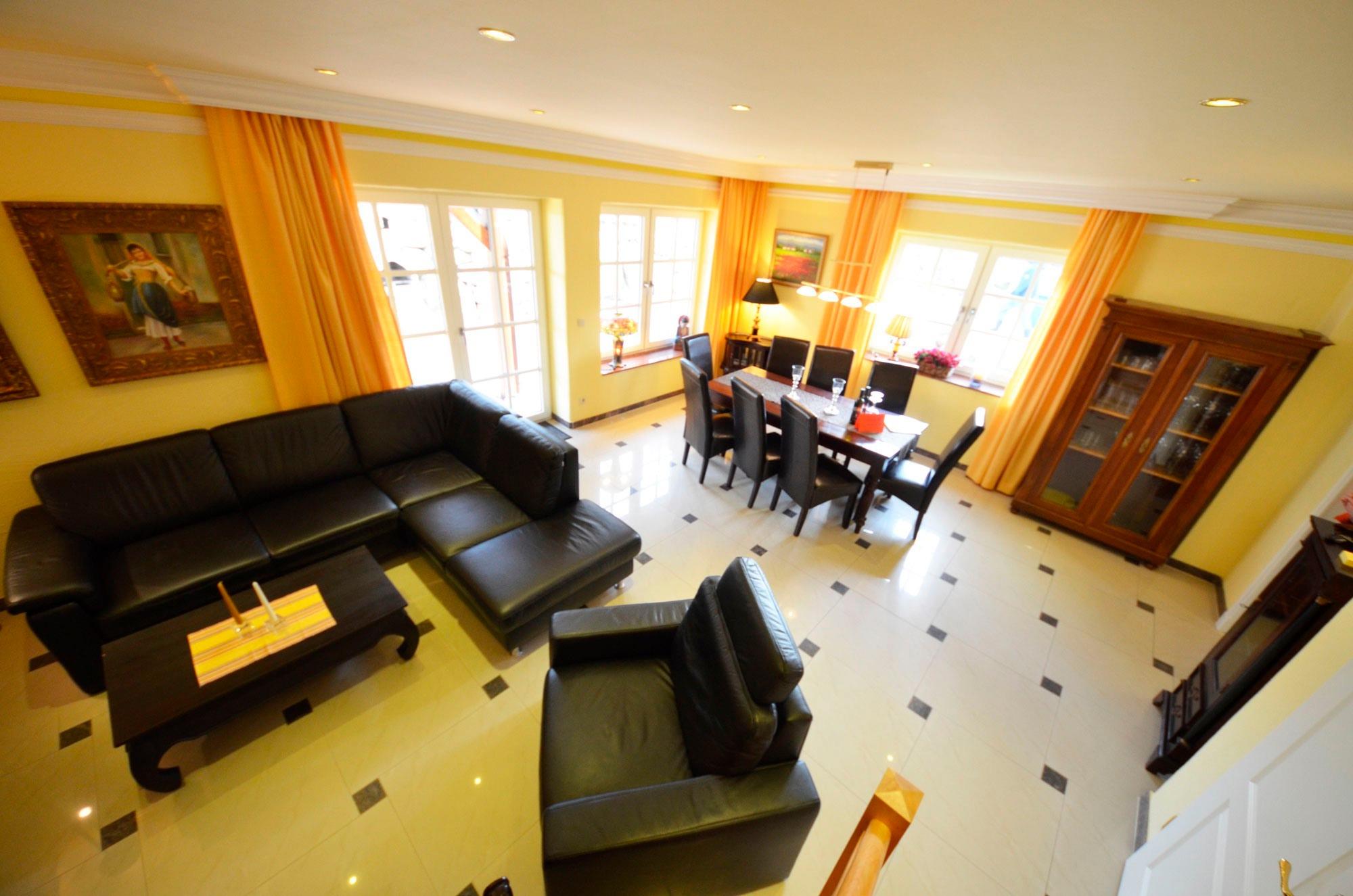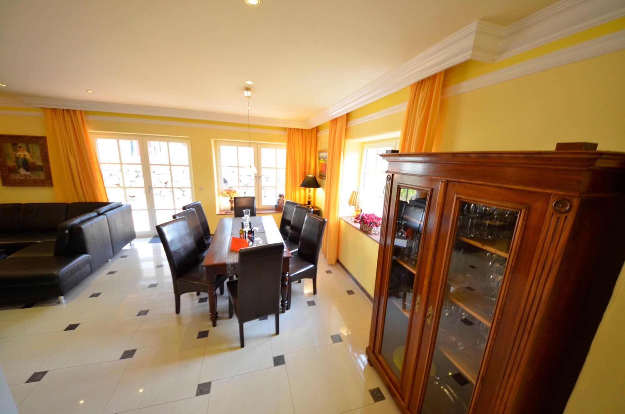 Solar - Fußbodenheizung, großzügiges Wohn- Esszimmer mit Ausgang zur großen Terrasse, schöne Leder-Couchgarnitur mit Opiumtisch, rustikale Speisetafel mit 8 Stühlen, großer Hark-Kaminofen, Holz ist kostenlos und am Haus gestapelt. Antiker Geschirrschrank, SAT-Plasma-Flach-TV mit 50 Zoll = 127cm Großbild, Video-Recorder, Stereoanlage, CD - Player, Kinderhochstuhl, Wände dekoriert mit Bildern, sehr dekorative Beleuchtung.
