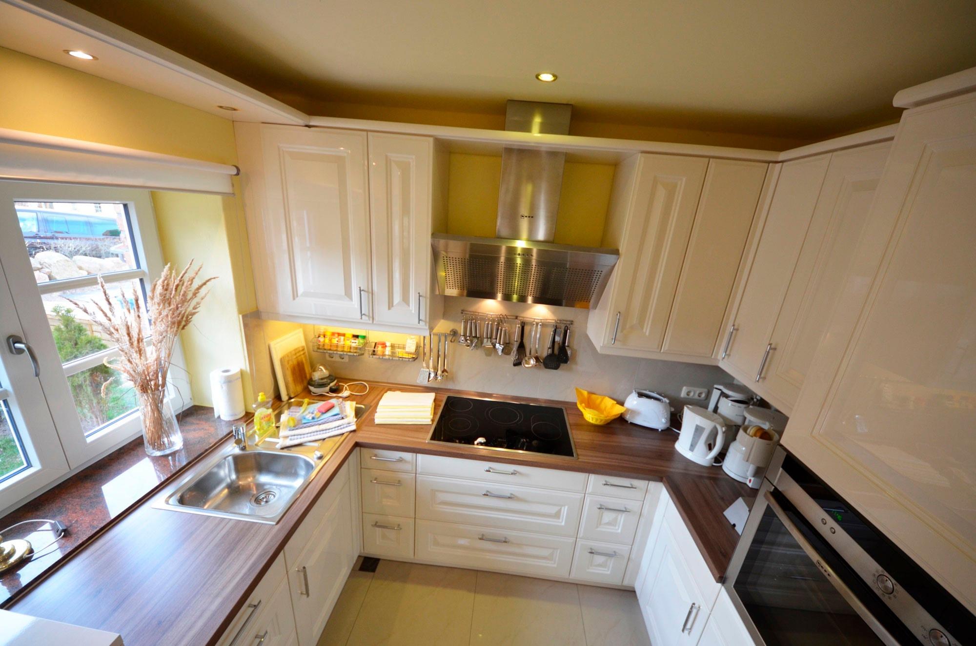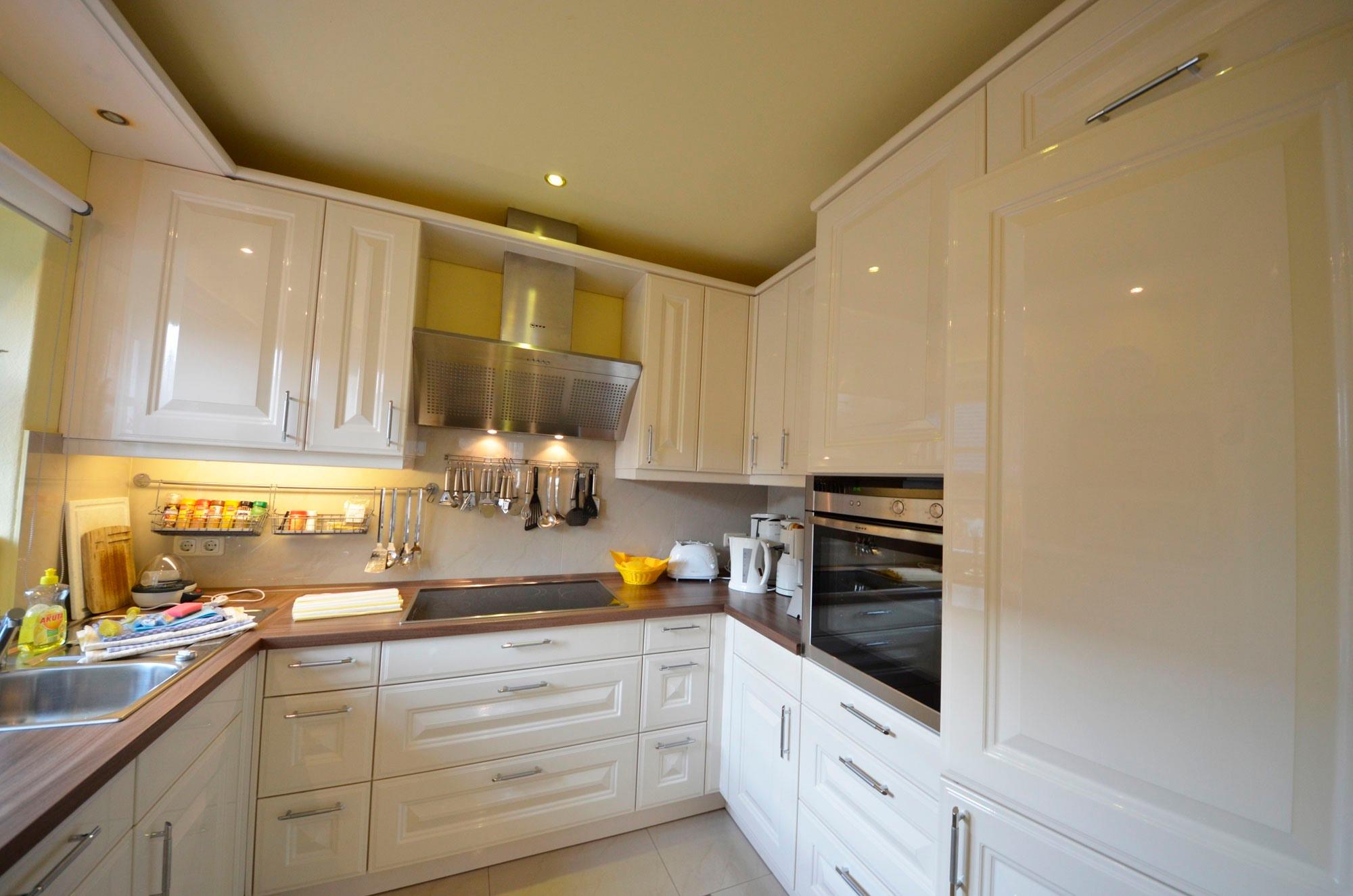 Luxus-Hochglanz-Einbauküche in Magnolie, höher gelegterGeschirrspüler, Mikrowelle, großer Kühlschrank mit ca. 40 l Gefrierteil - Herd mit Ceran -Kochfeld, Backofen, Vertikal-Turmhaube. 2 Kaffeemaschinen, Wasserkocher, Eierkocher, Toaster, Waffeleisen, Mixer, ausreichend Edelstahltöpfe, Schnellkochtopf, Gewürze usw. Dekorative Beleuchtung.