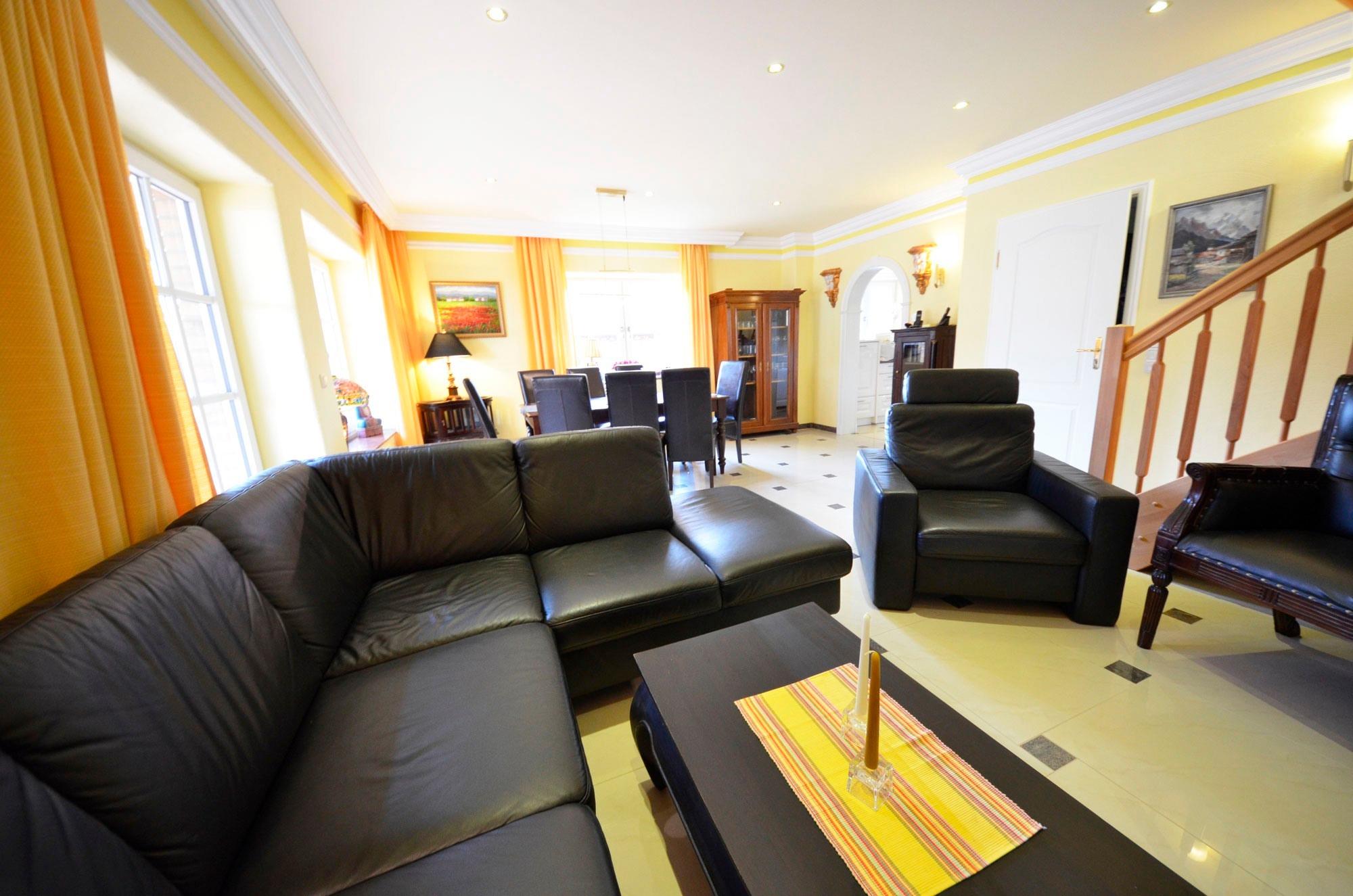 Das Ferienhaus ist bis zu 8 Personen u. Baby geeignet: Das Haus verfügt über 4 Doppelschlafzimmer, 4 Bäder und Sauna. Im OG teils mit elektrischen Rollläden, teils mit Velux-Verdunkelungsrollos.