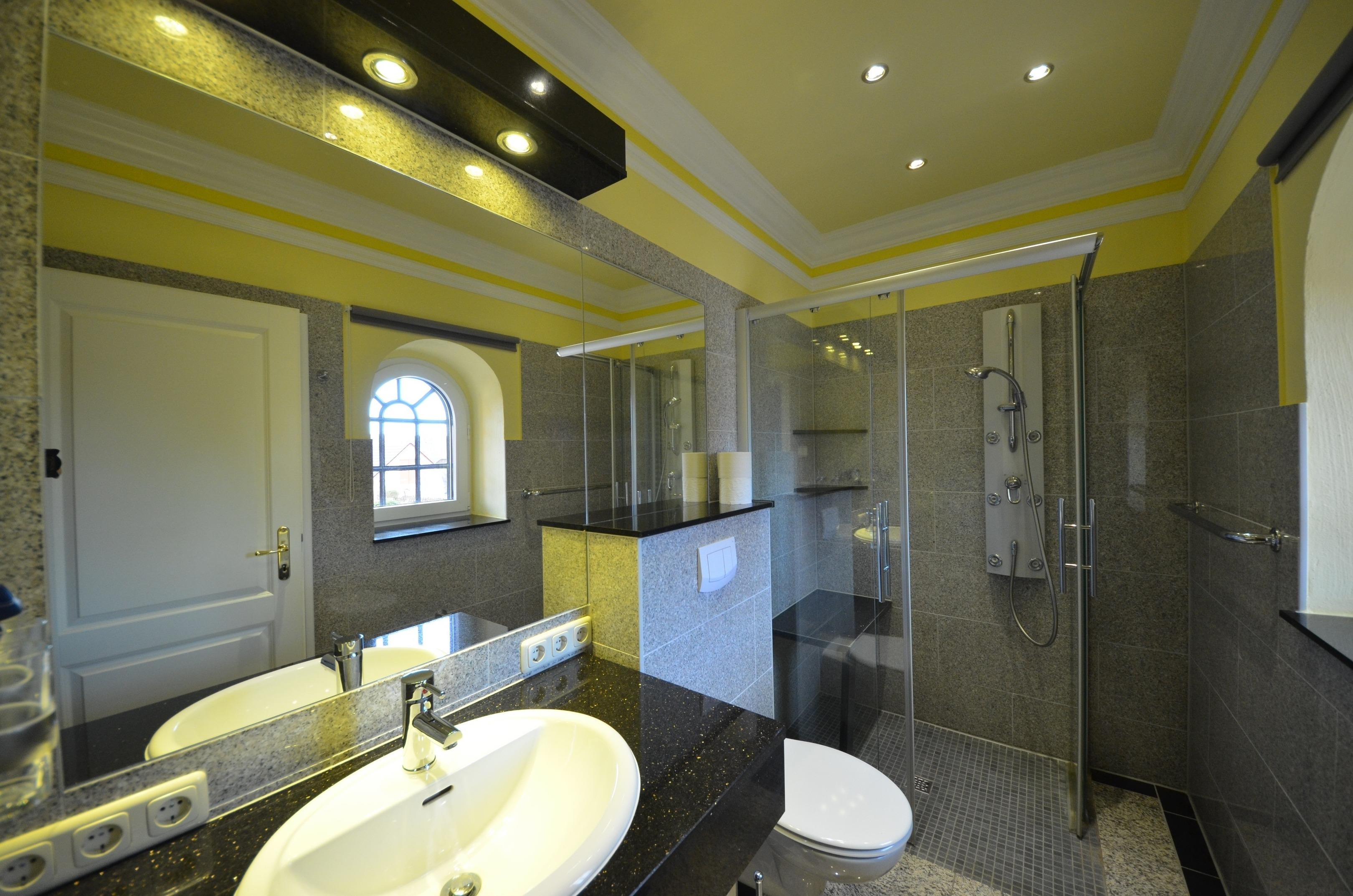 1 Bad im EG, 2 Bäder im OG und 1 Bad im Dachgeschoß. Fußbodenheizung im EG u. OG, Granitabdeckungen und Granitwandverkleidungen. Alle Waschtischabdeckungen aus schwarzem Granit "Star Galaxy". Große Spiegel, 2 Bäder mit walk-in-Duschen 100 x 140 - 160cm und 2 x mit Bidet. Alle Bäder mit Außenfenstern, beheizbaren Handtuchhaltern, Föhn, Schminkspiegel , schöne Sanitärausstattung in Pergamon. Teilweise Massage-Duschbatterie. Teilweise Sitzgelegenheiten in den großen Duschen, 1x Wanne mit Duschabtrennung.