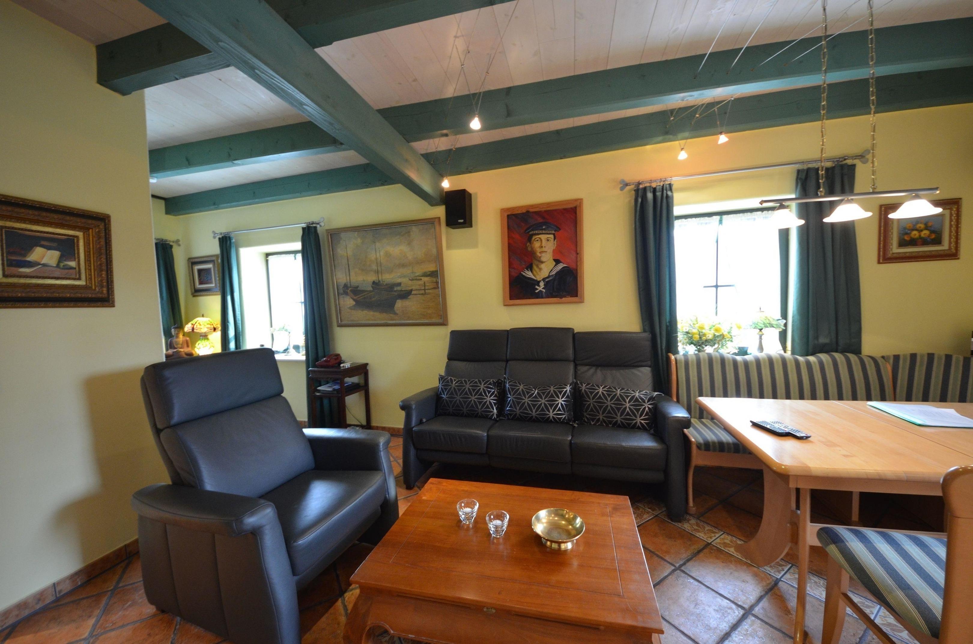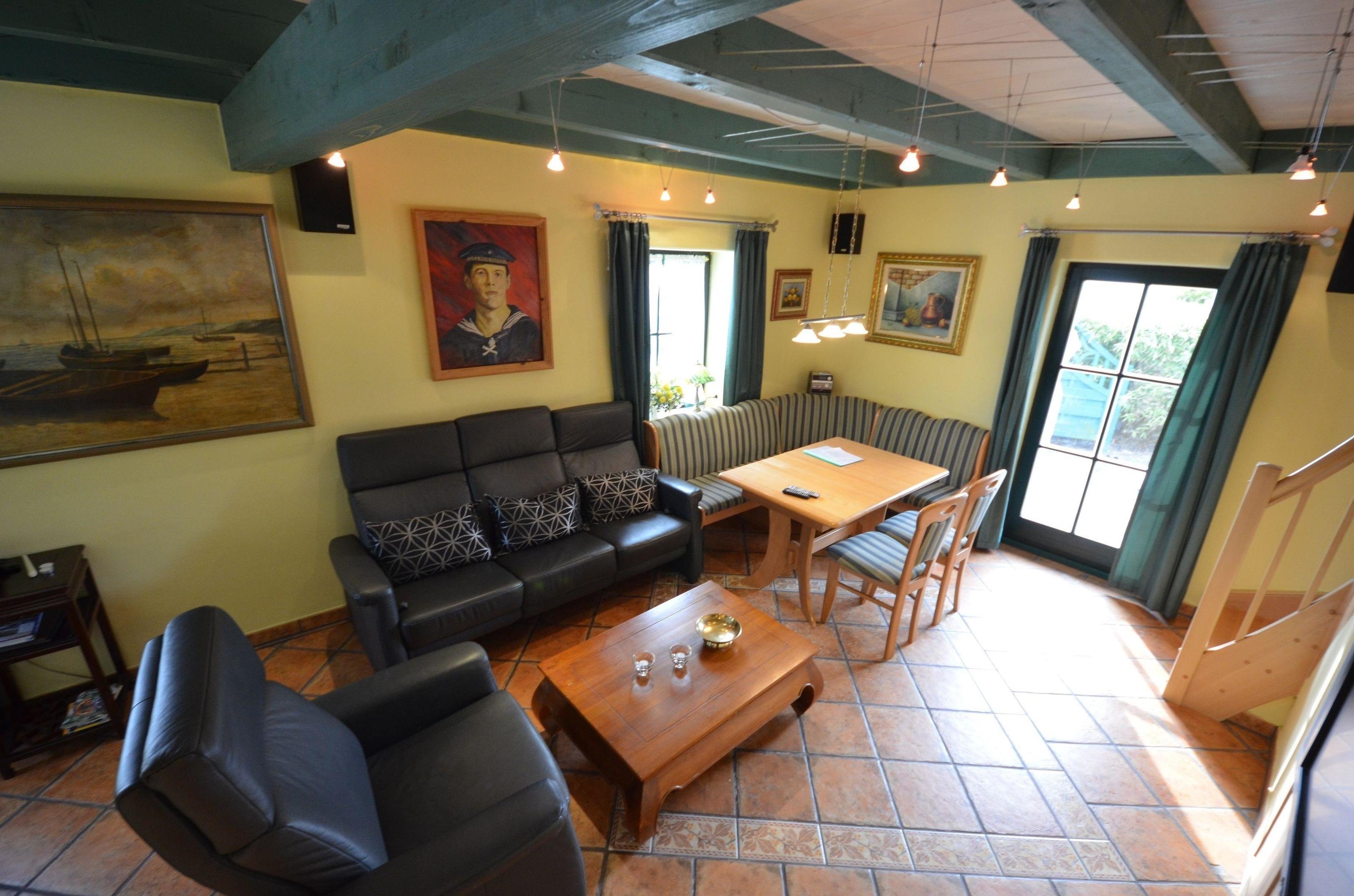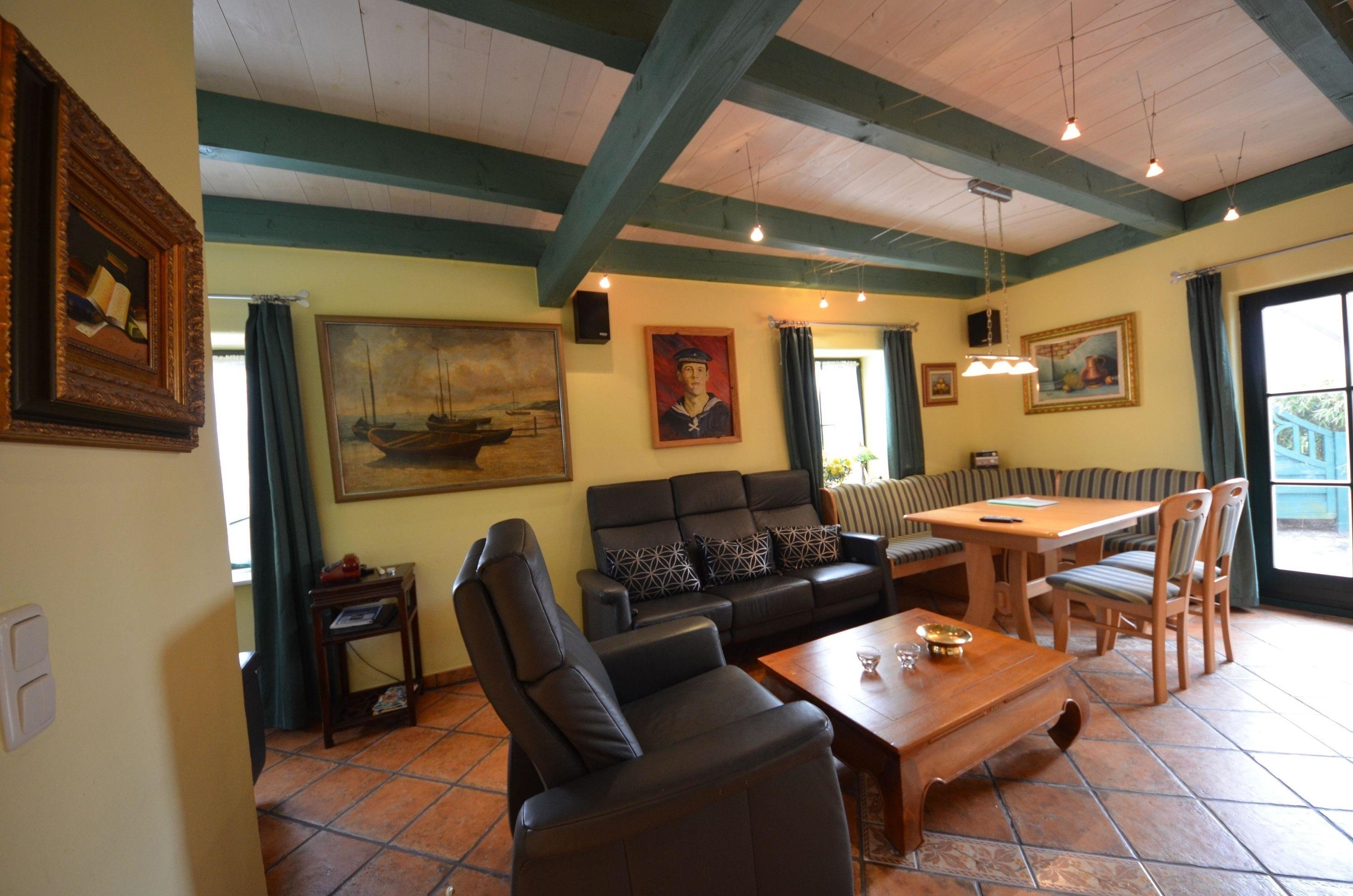 Gemütliches Wohnzimmer mit Deckenbalken und Ausgang zur mit Pflanzen eingewachsenen Terrasse mit Teak-Gartenmöbeln, Essecke für 6 Personen, schöne Couch-Garnitur mit Opiumtisch, 90er - Flachbild - TV, Stereo / CD, Geschirrschrank, Fußbodenheizung, Telefontisch mit Telefon, Kinderhochstuhl, Wände dekoriert mit Bildern, sehr dekorative Beleuchtung