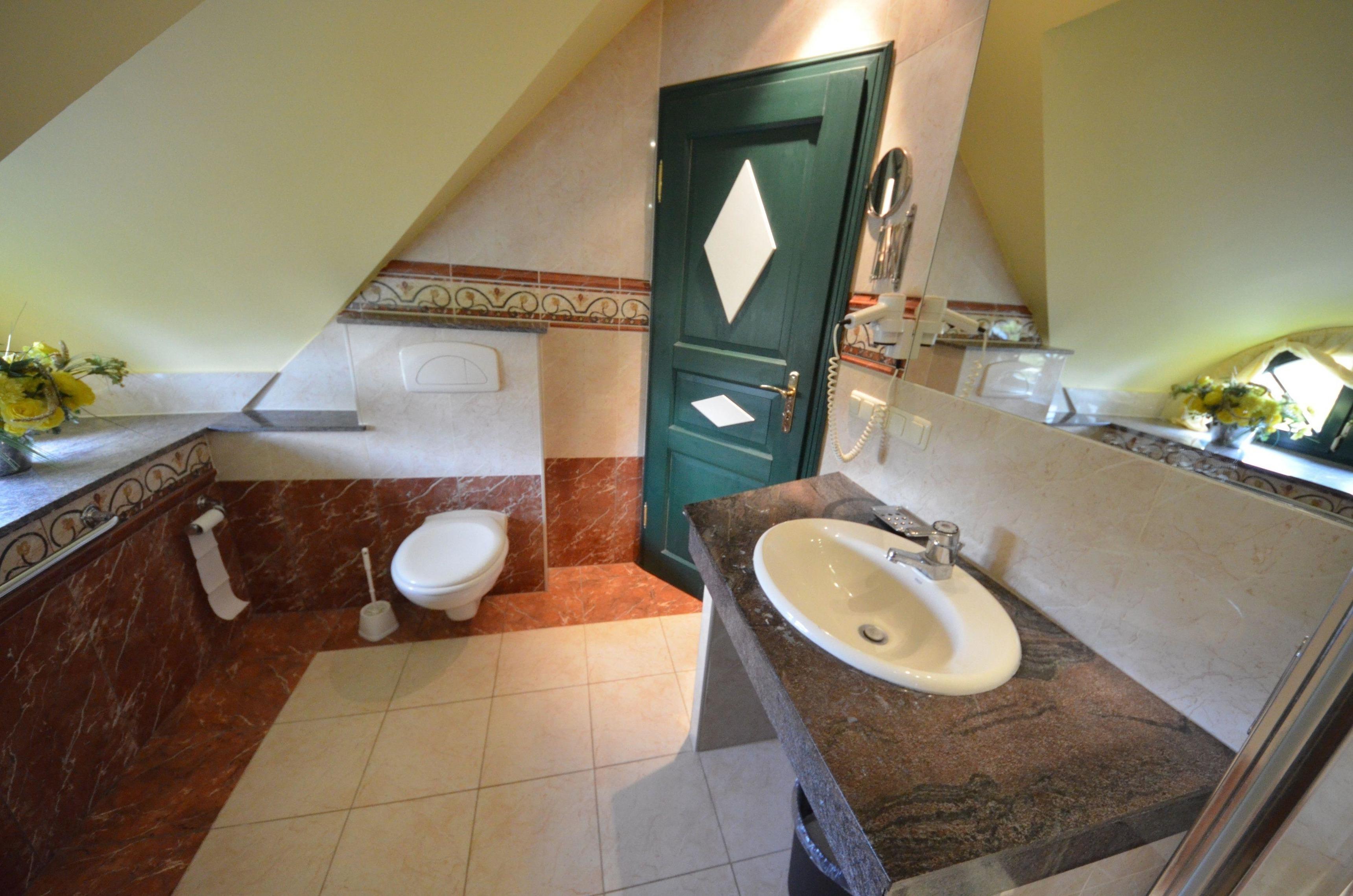 Glas- Dusche, Rundbogenfenster, Fön, Schminckspiegel, Fußbodenheizung, Natursteinabdeckungen, großflächige Spiegel, schöne Sanitärausstattung, beheizbarer Handtuchhalter.