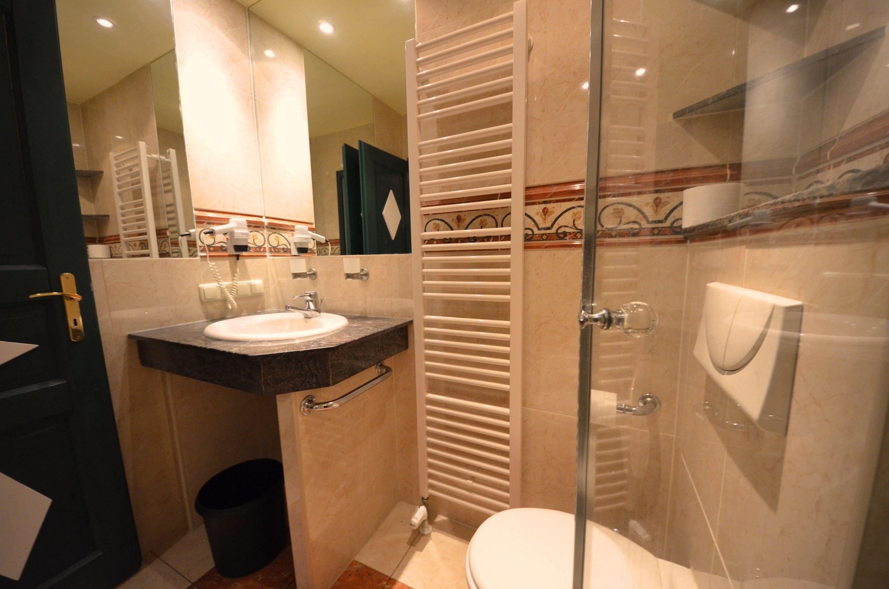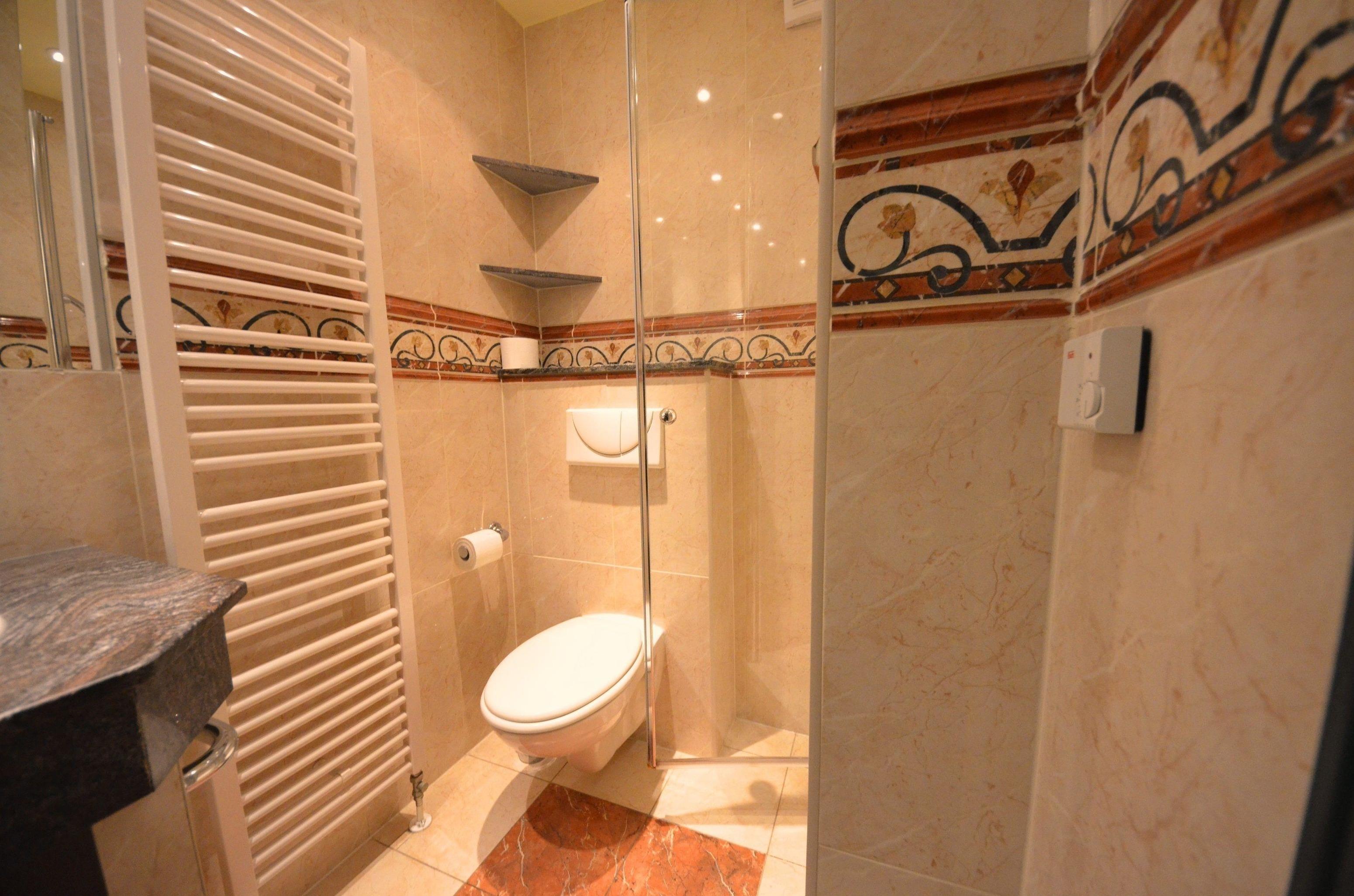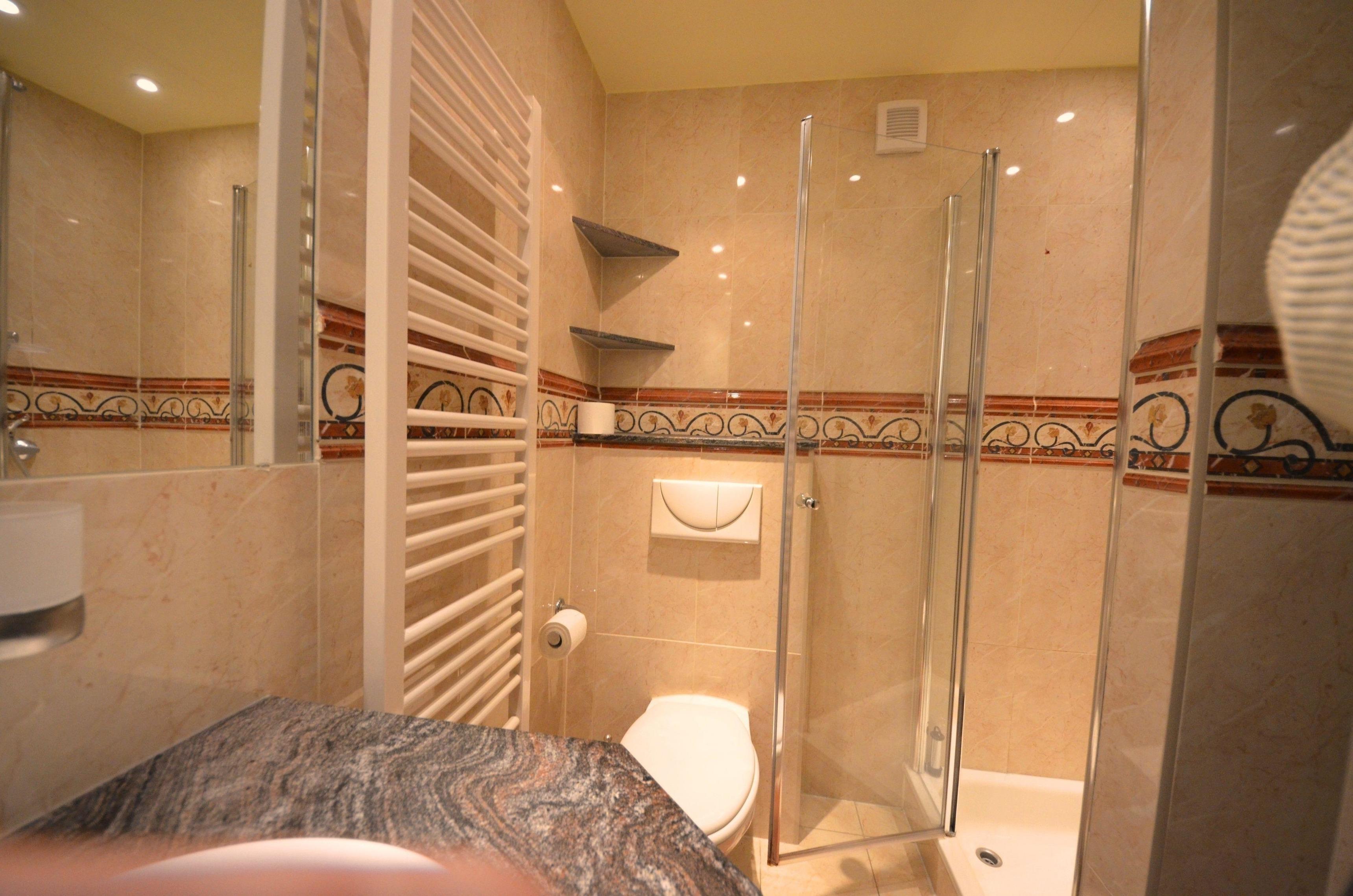 Glas – Dusche, Granitverkleidung, Fön, Schminkspiegel. Fußbodenheizung, Natursteinabdeckungen, schöne Sanitärausstattung, beheizbarer Handtuchhalter,