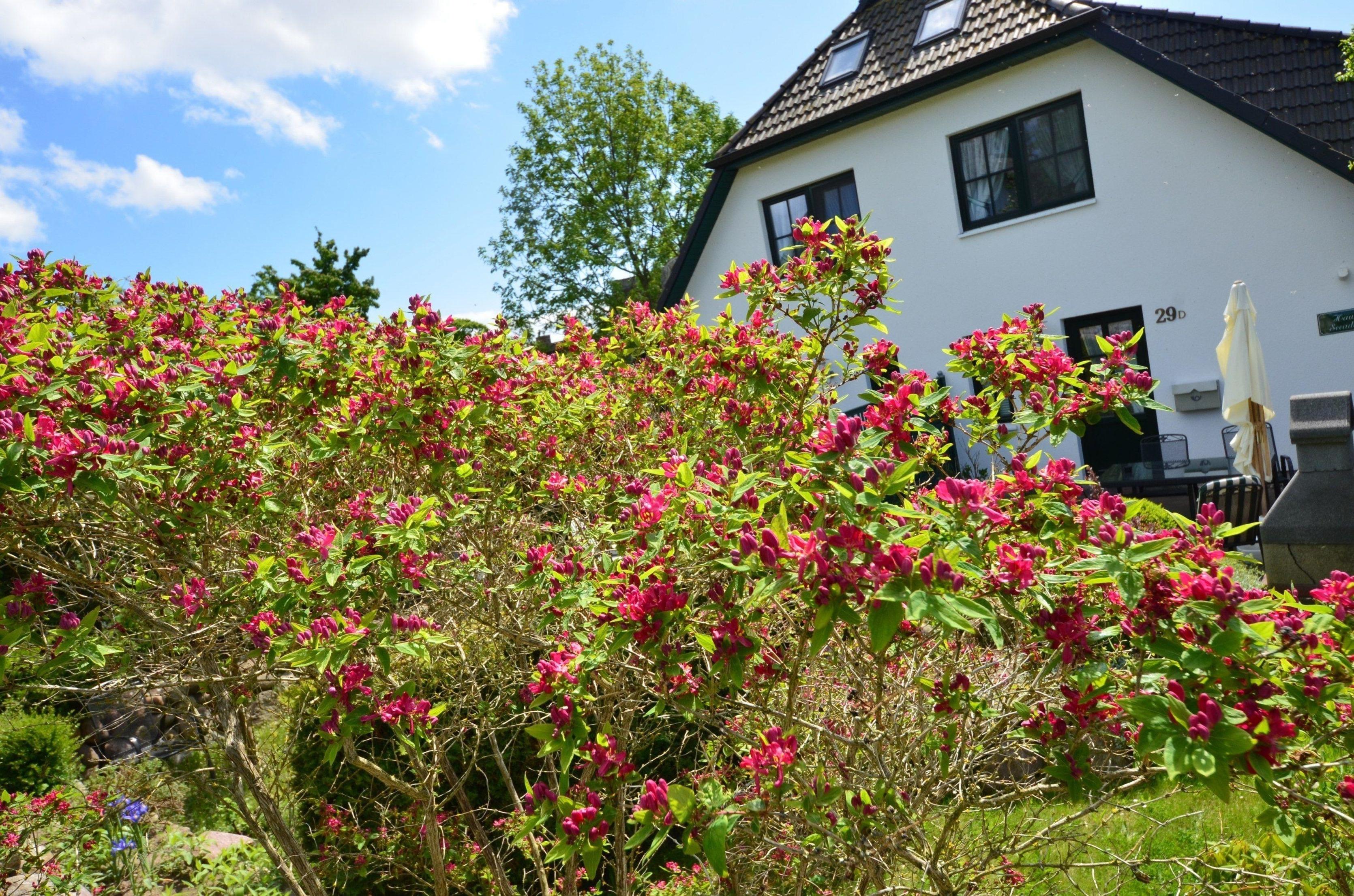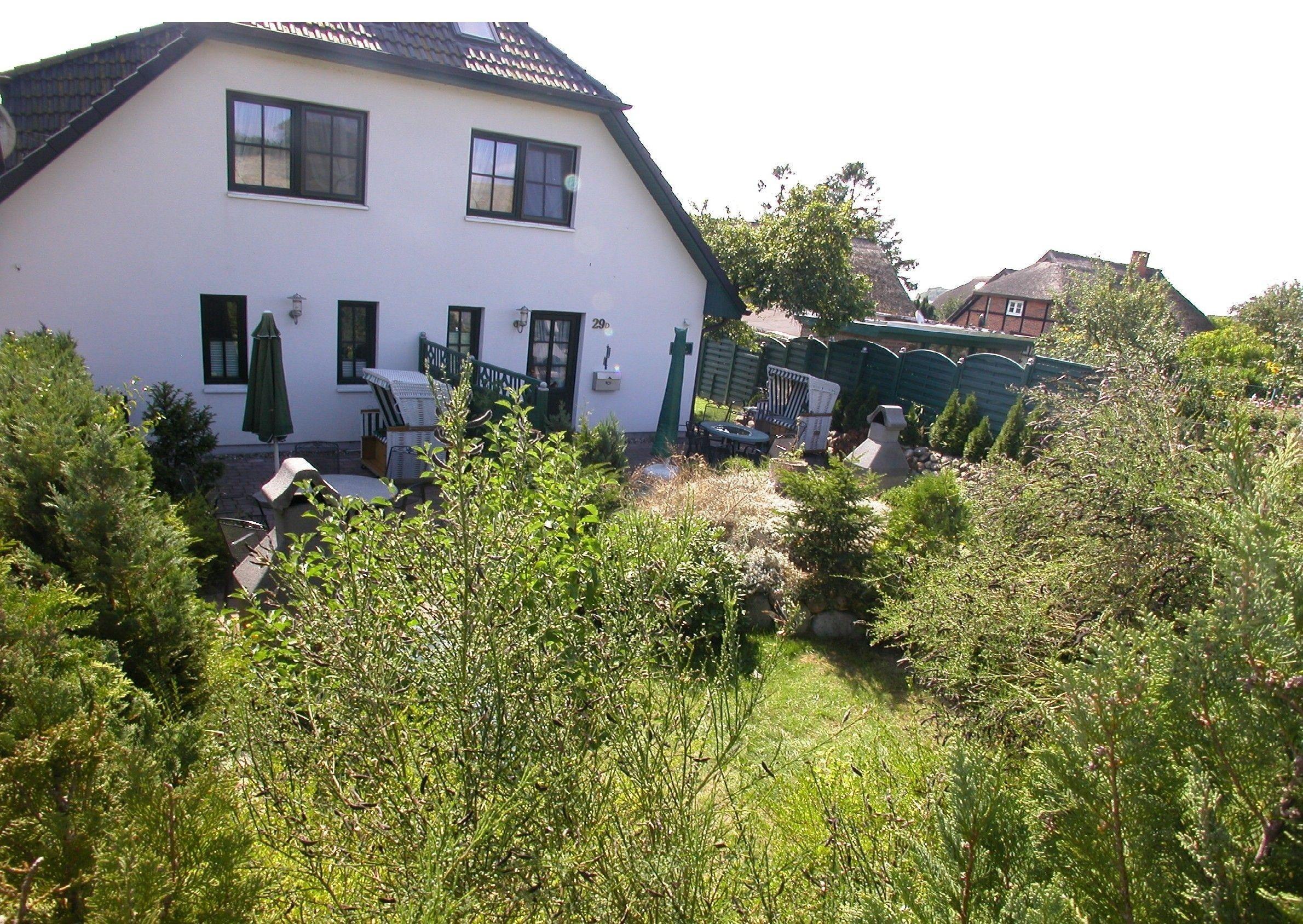Das Haus hat einen eigenen separaten Eingang. Vor der Eingangstür befindet sich ein Garten mit Terrasse Gartenmöbeln und Strandkorb sowie ein Gartengrill.
