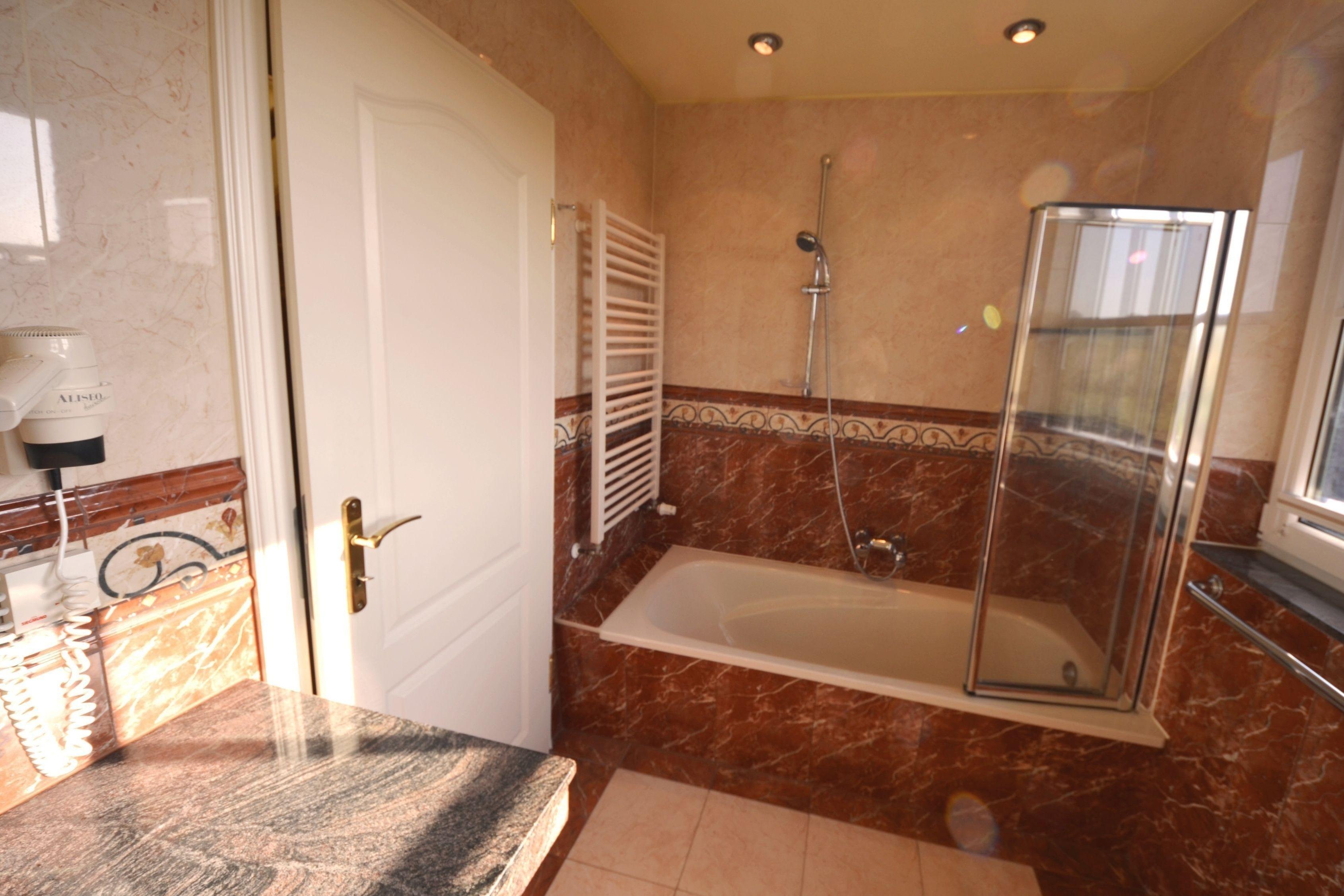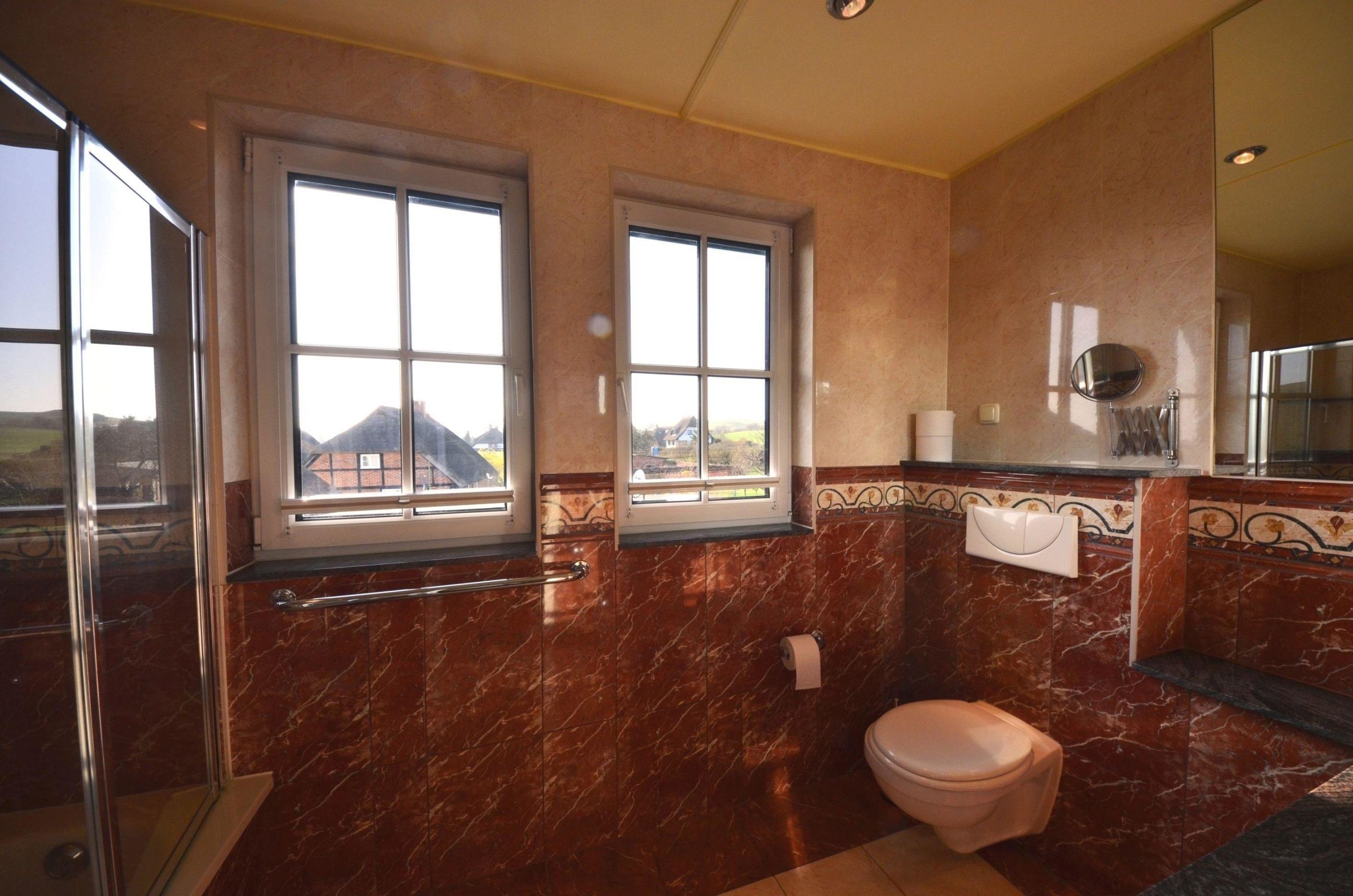 Fußbodenheizung, Natursteinabdeckungen, großflächige Spiegel, schöne Sanitärausstattung, beheizbarer Handtuchhalter.