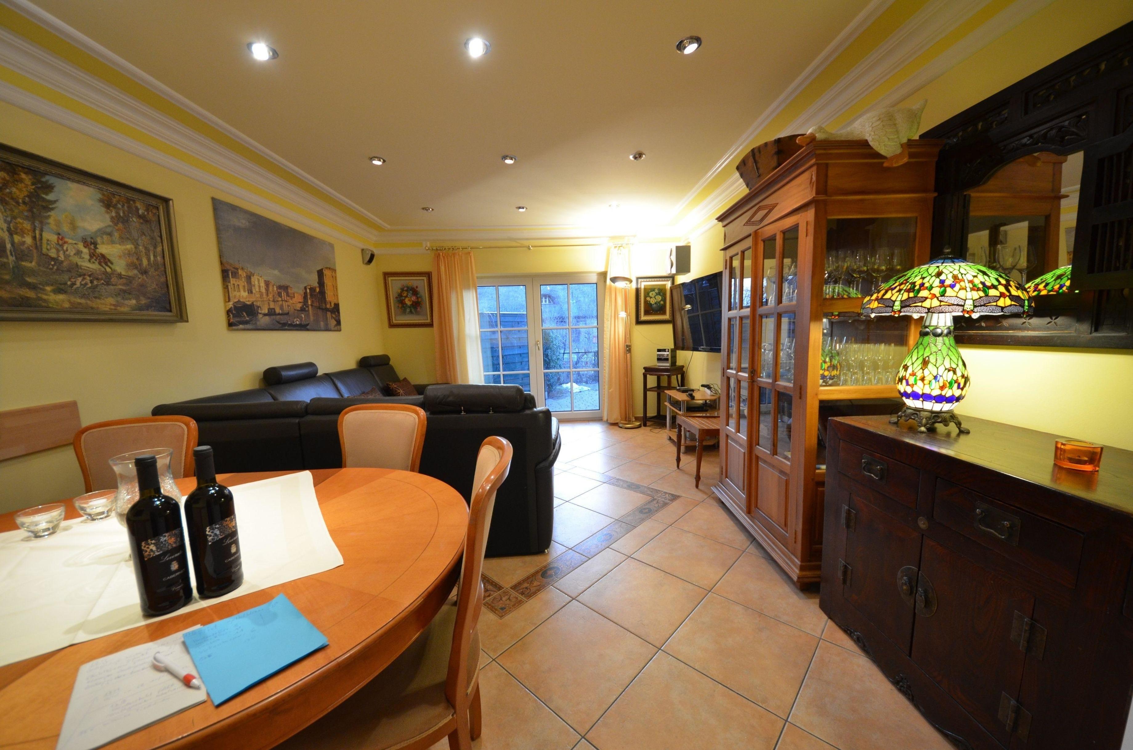 Wohn- Esszimmer mit Ausgang zur Terrasse mit Gartenmöbeln,