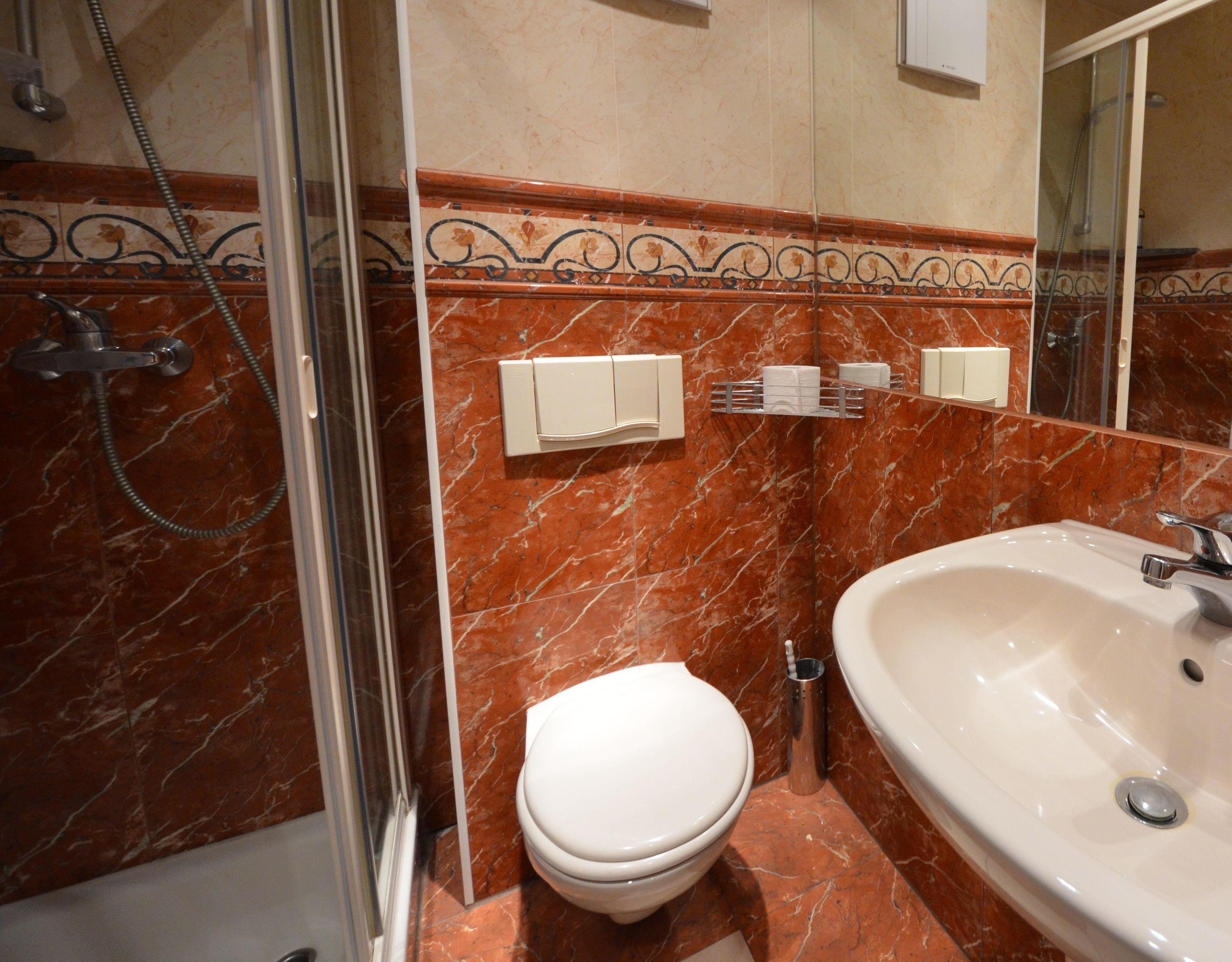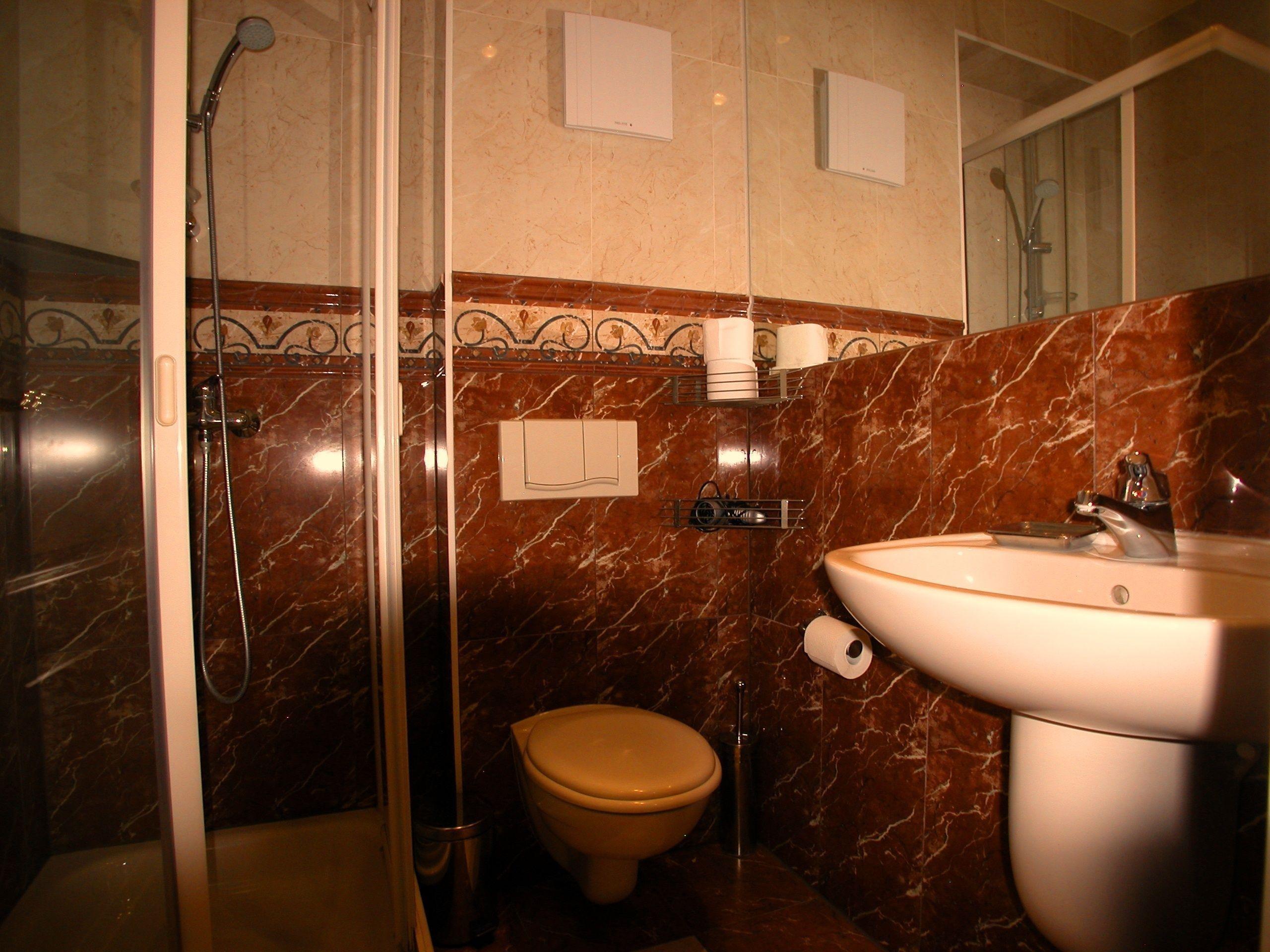 1 Bad mit Dusche aus Naturstein / Granit mit Fön und Schminkspiegel