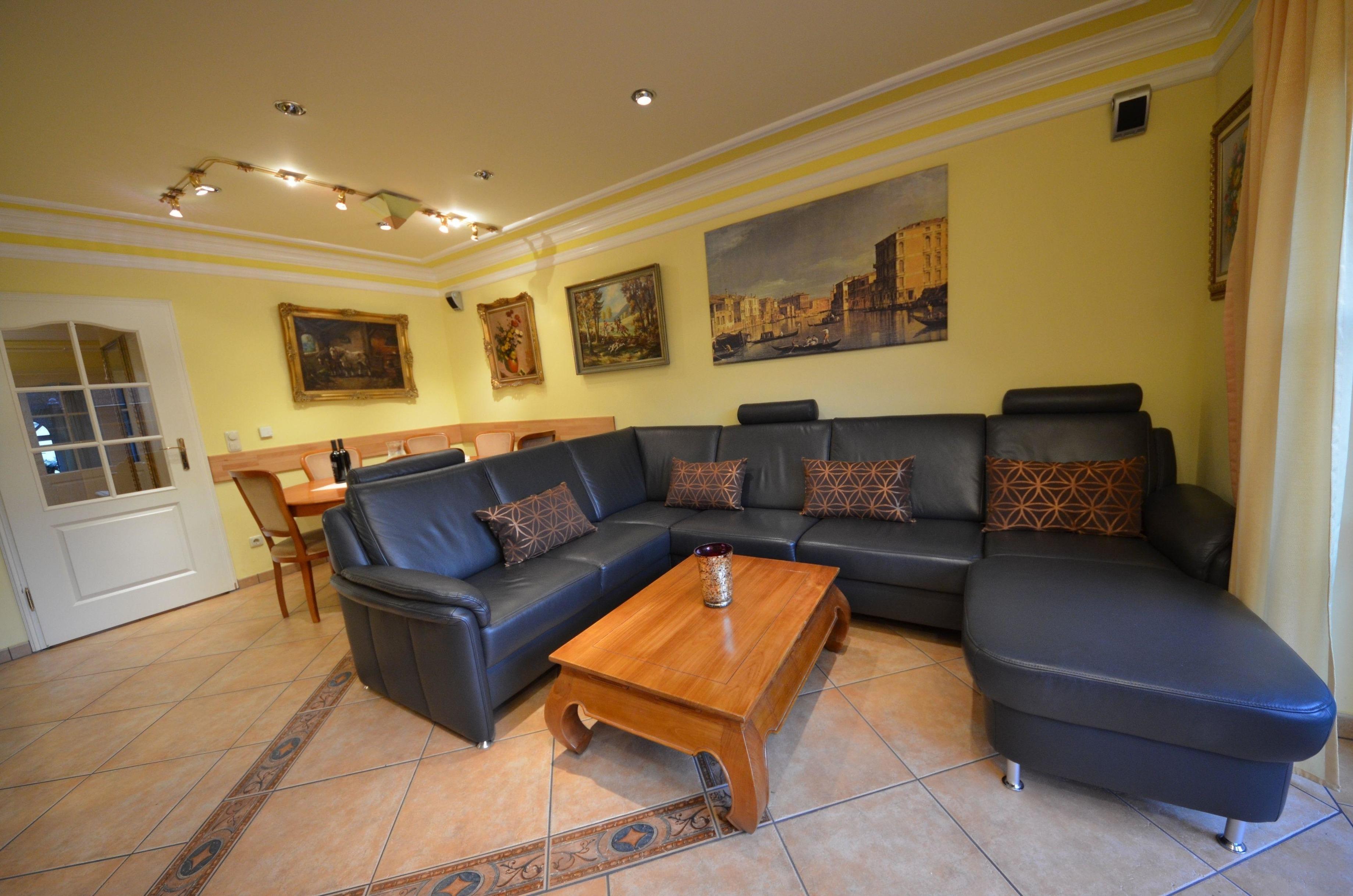 schöne Couch-Garnitur und Opiumtisch, Telefon, 120er - Flachbild - TV,