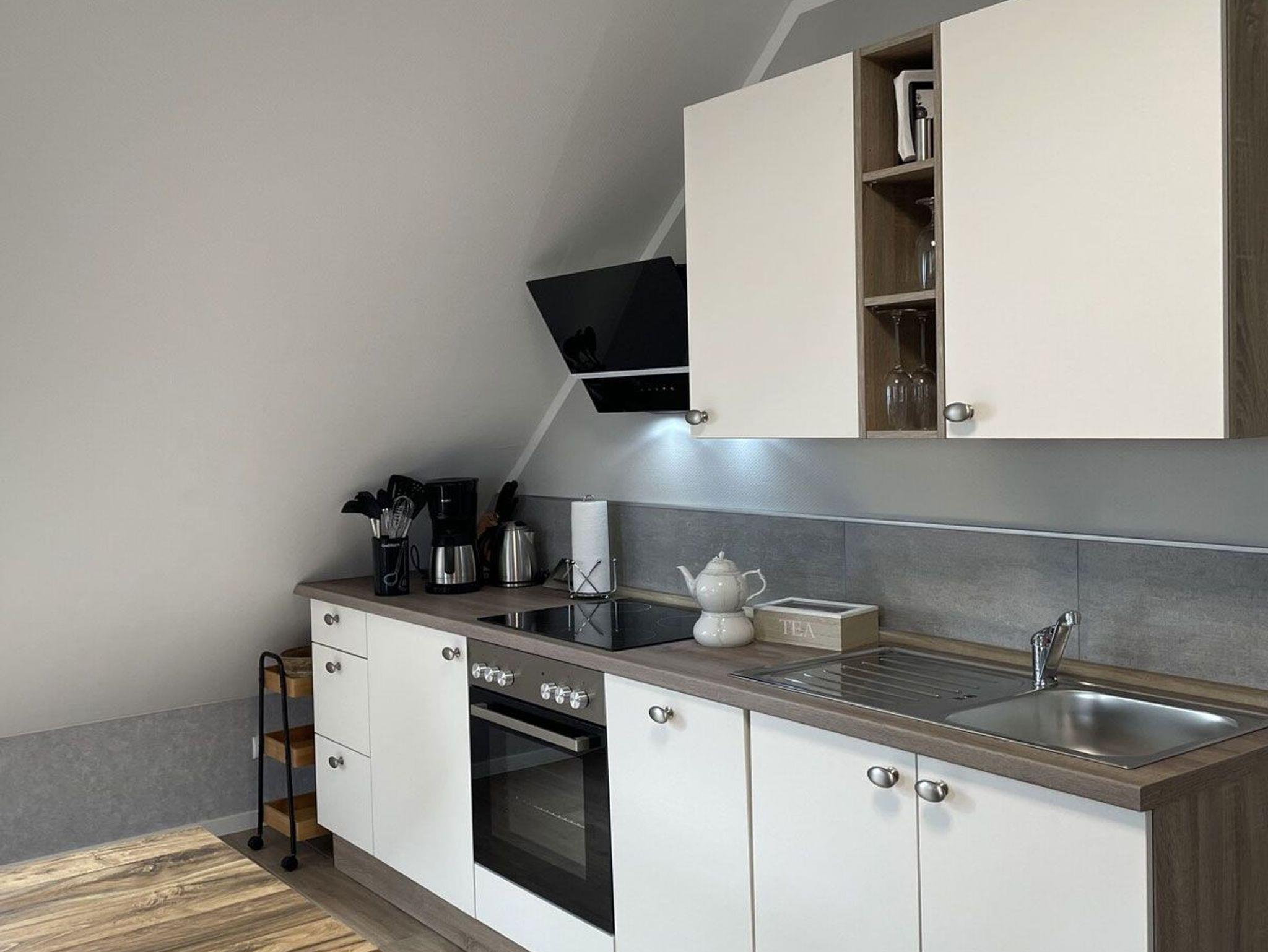 Induktionsherd, E-Backofen, Kühlschrank mit Gefrierfach, Wasserkocher, Kaffeefiltermaschine, Spülmaschine, Toaster, Heißluftfritteuse ,Besteck & Geschirr, vers. Gläser, Esszimmertisch mit 4 Freischwinger-Stühle -