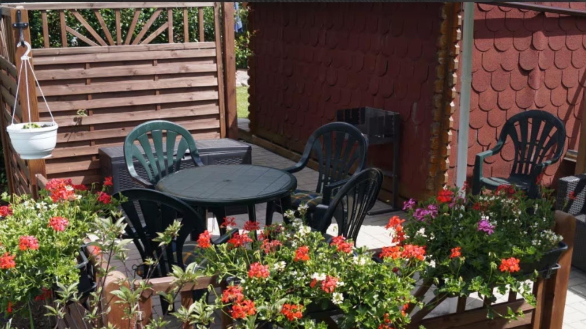Hier steht Ihnen eine eigene Terrasse mit Gartenmöbeln und Grill