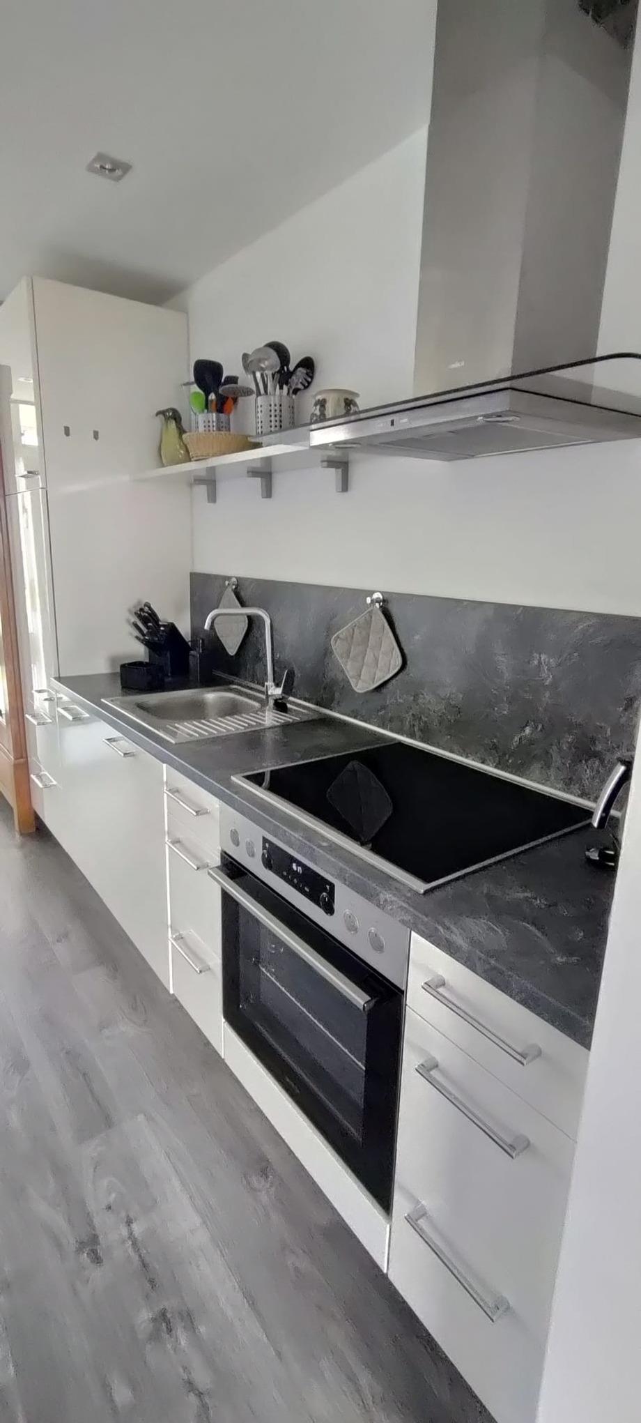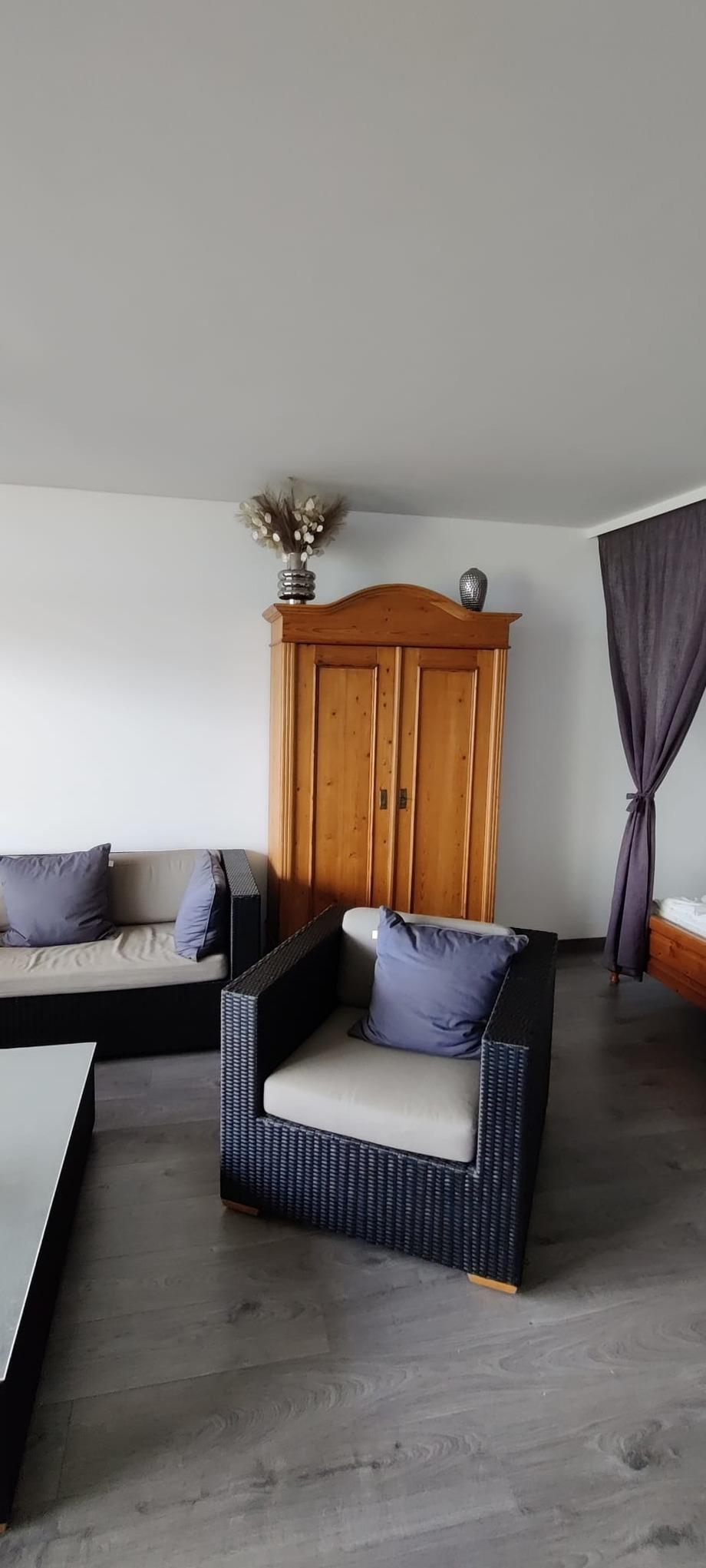 Weiter gibt es hier einen Esstisch mit 4 Stühlen, einen kleinen Kiefernholz-Bauernschrank und eine Anrichte, Flachbild-TV und Radio mit CD-Player. In einer Schlafnische stehen das Doppelbett (je 80 x 200 cm) sowie 2 Nachtschränke.