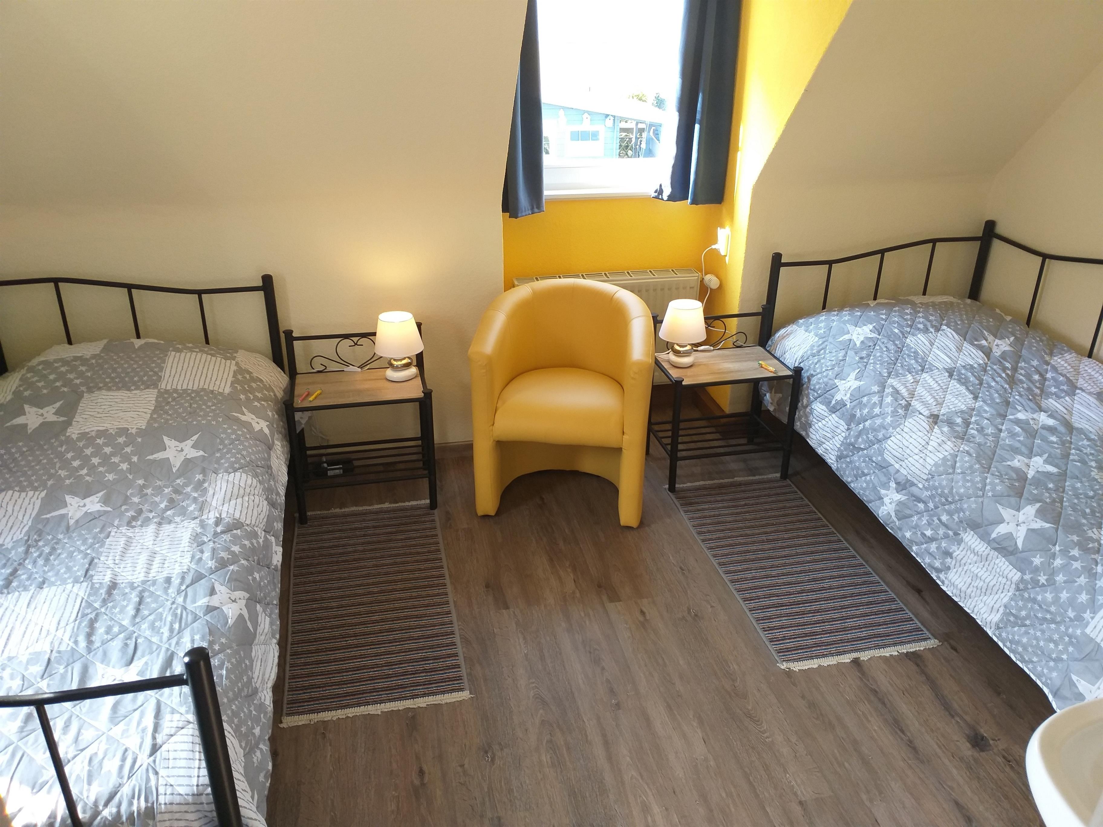 Im anderen Zimmer befinden sich 2 Einzelbetten, Flachbildfernseher und ein großes Waschbecken.