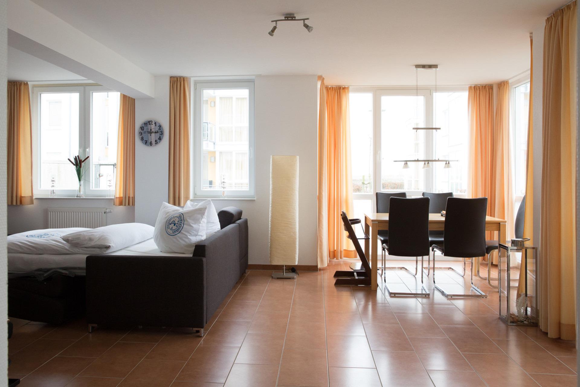 Im gemütlichen, großen Wohnraum können Sie Ihren Tag planen. Ist es einer der vielen Sonnentage; wird es wahrscheinlich ein Tag am Meer?! Der wunderschöne Südstrand von Großenbrode ist ca. 80m entfernt. Für die Saison (Mai - September) haben wir bereits einen Strandkorb reserviert. Dieser steht unseren Gästen am Strand kostenfrei zur Verfügung.
