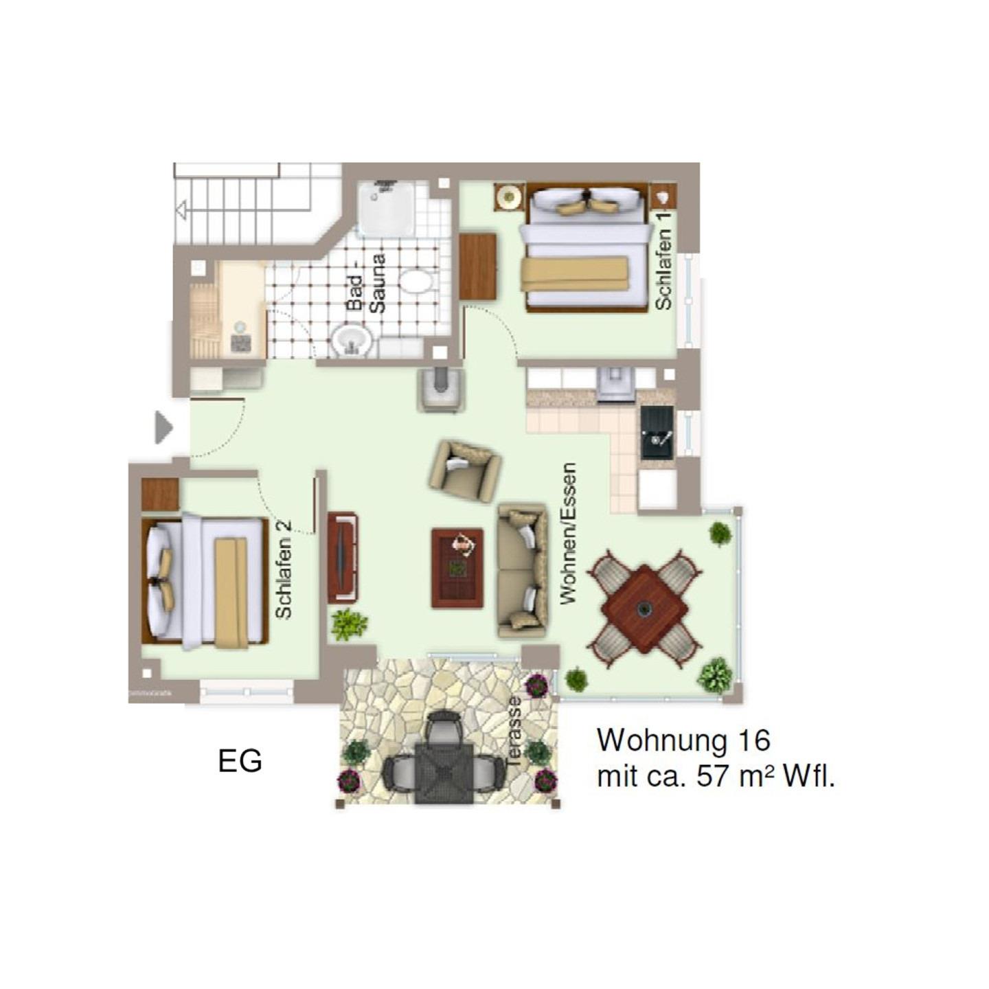 Die Wohnung wurde modern und entsprechend eingerichtet. Es erwarten Sie auf 56 qm ein gemütlicher Wohnraum mit einer Essecke, einer offenen Küche, zwei Schlafzimmer mit je einem Doppelbett und jeweils einem Fernseher.
