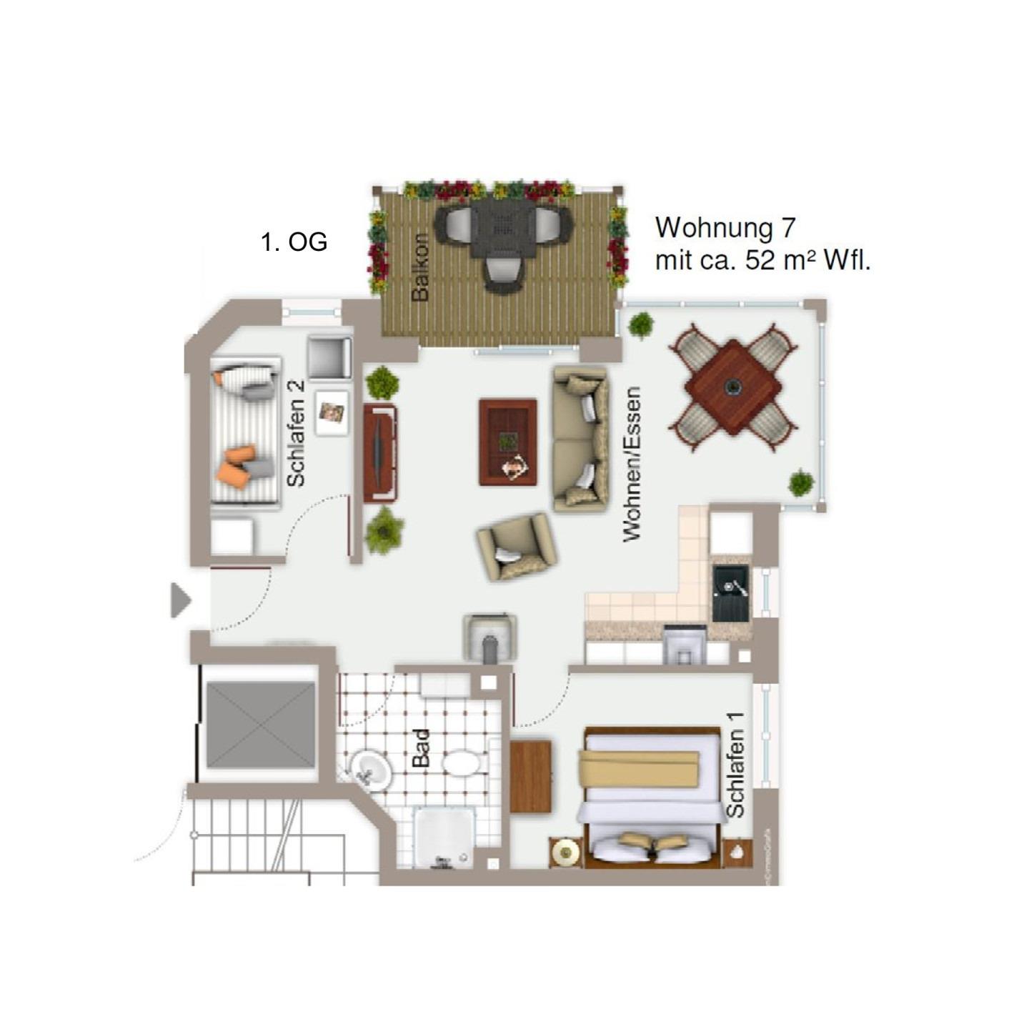 Die Wohnung befindet sich im 1. Stock. Der Balkon ist nach Nord-Nord-Ost ausgerichtet mit Blick auf den Kurpark. Ab dem Nachmittag können Sie die Abendsonne auf dem Balkon genießen und den Blick schweifen lassen.
