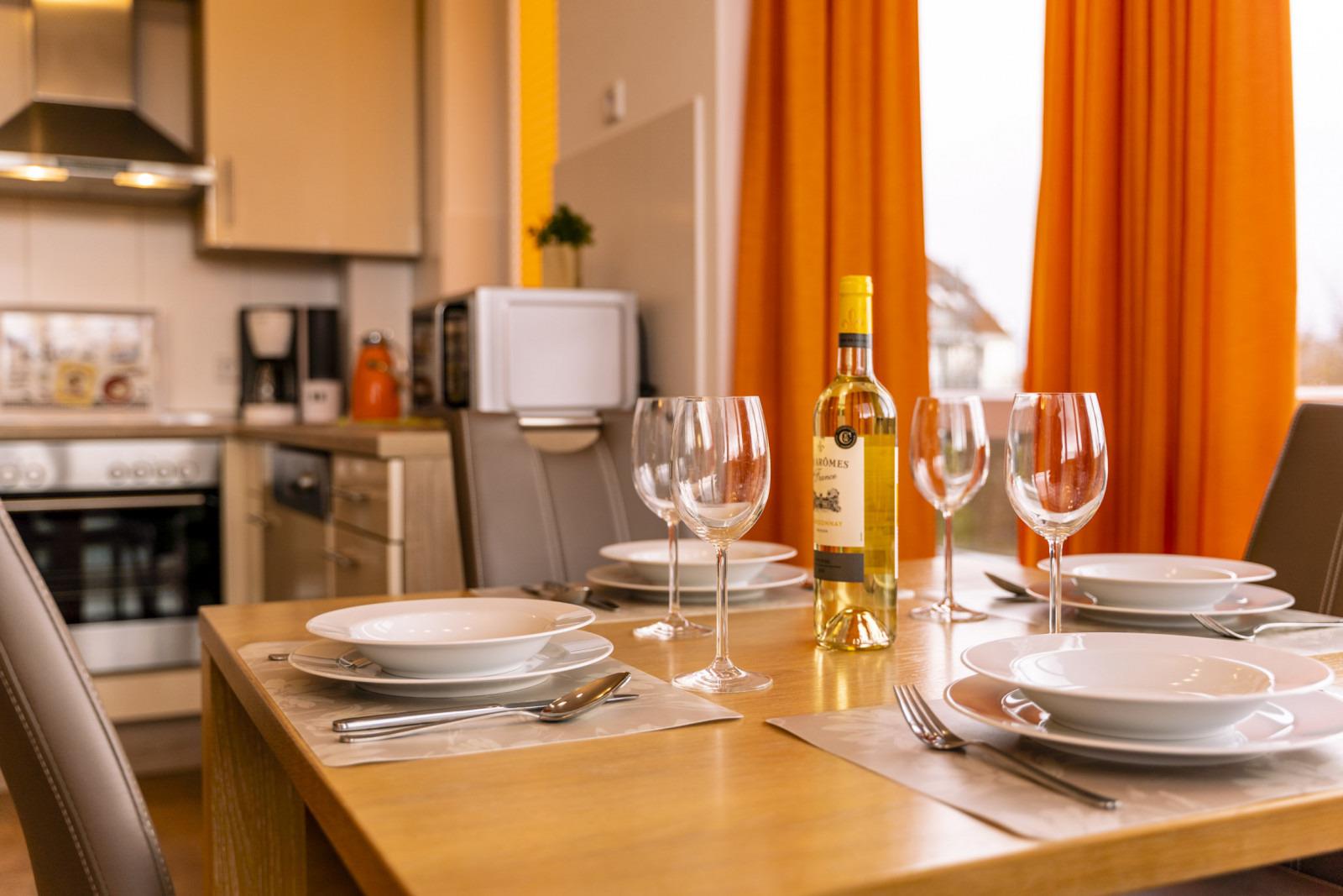 Unsere Wohnung verfügt über eine bestens ausgestattete Küche (u. a. Spülmaschine, Wasserkocher, Mikrowelle, Mixer), einen hellen Essbereich, ein Schlafzimmer mit Boxspringbett und ein kleines Zimmer mit einem Doppelstockbett.