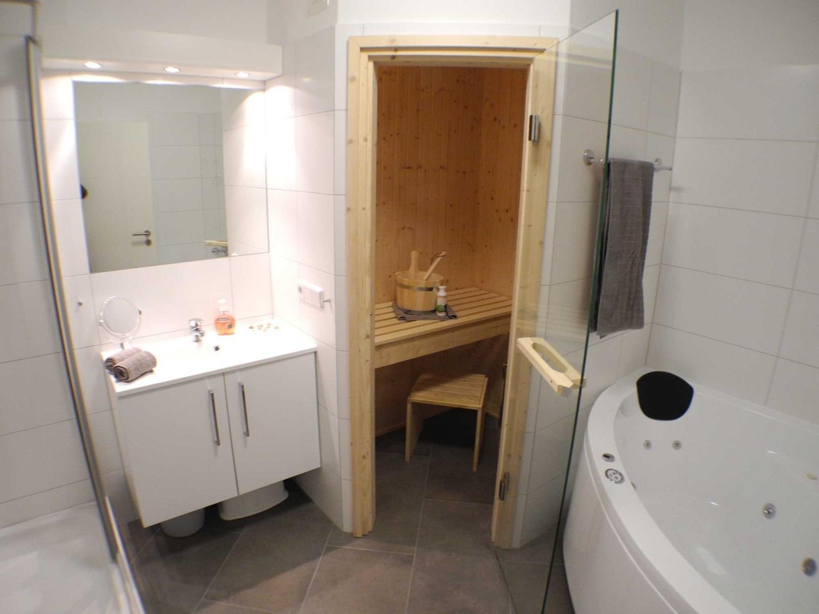 Zu Ihrer Erholung steht Ihnen ein tolles Wellness - Bad mit wohnungseigener Sauna, Whirlpool und Dusche zur freien Verfügung.
