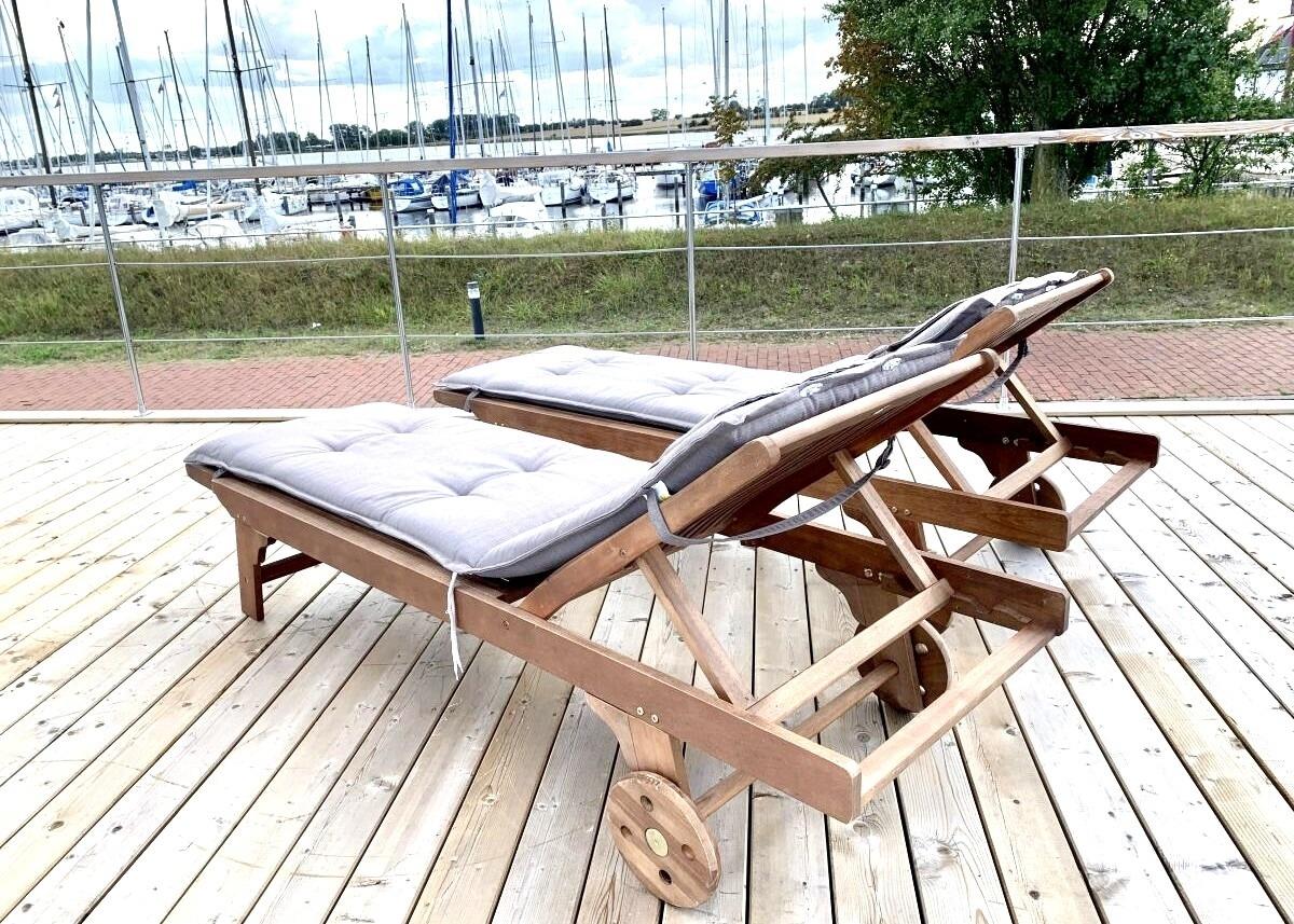 Von der ca. 30 qm2 großen Dachterrasse mit Strandkorb und 2 Sonnenliegen haben Sie einen atemberaubenden Rundumblick über die Bucht oder Sie geniessen die Zeit auf der meist windgeschützten unteren Terrasse mit Kuschelecke und genügend Sitzgelegenheiten.