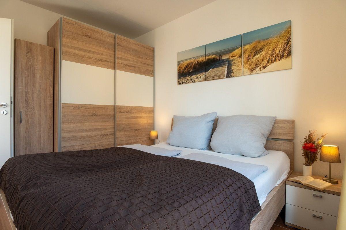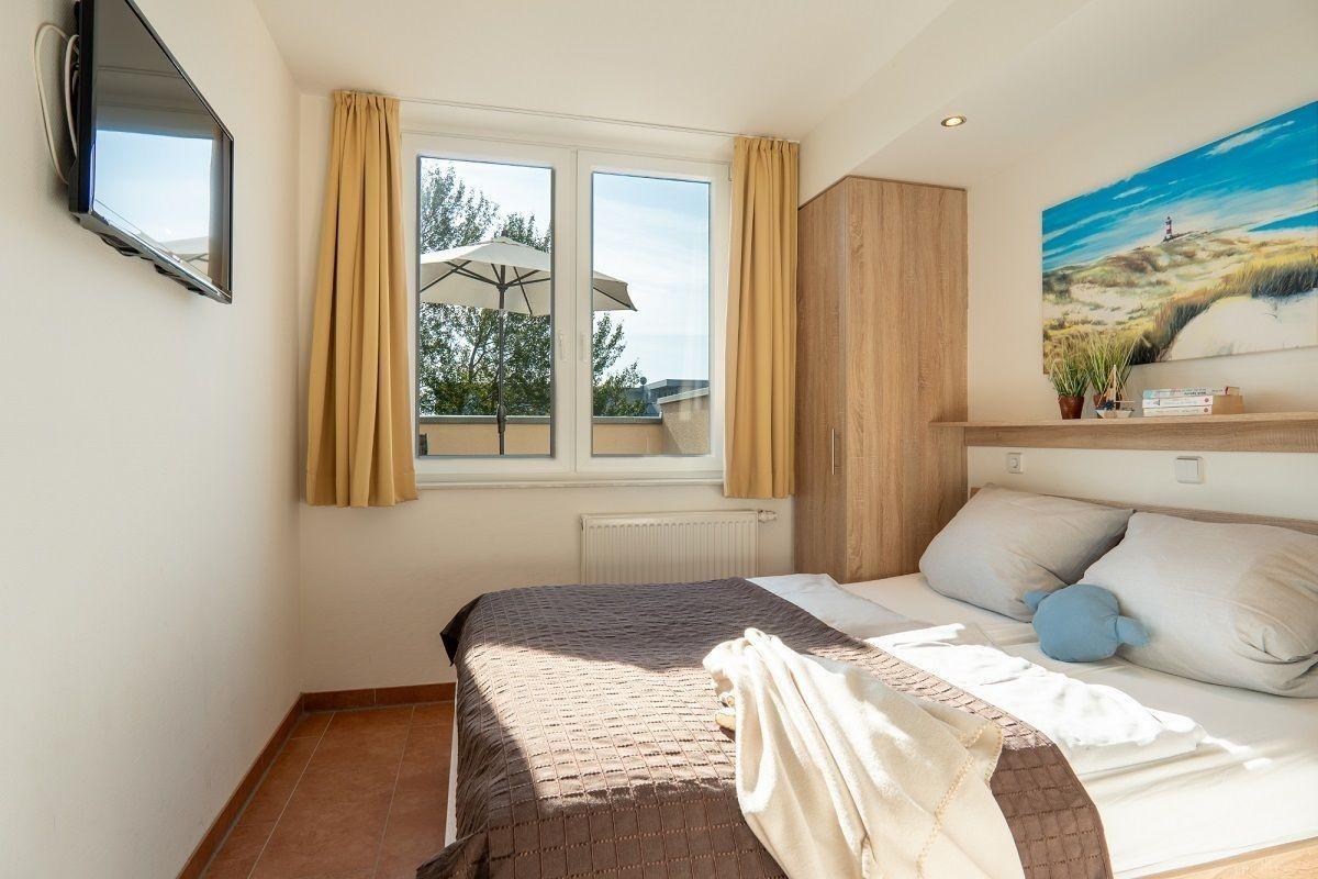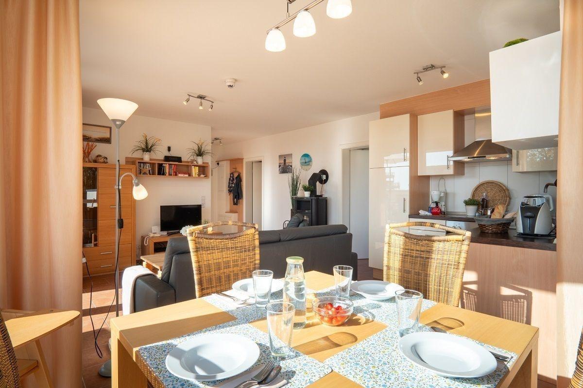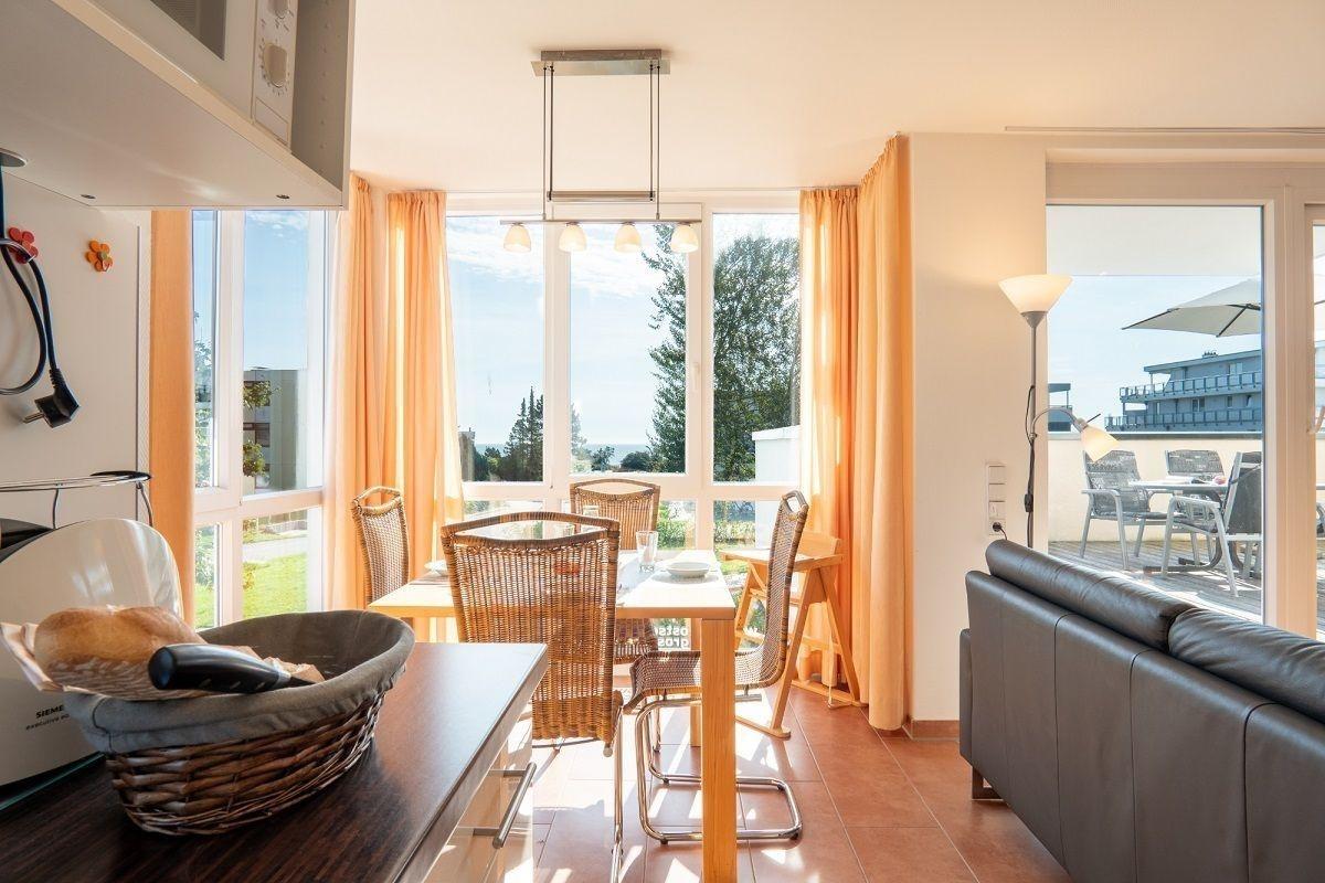 Die Wohnung verfügt über einen lichtdurchfluteten Wohnbereich mit einer gemütlichen Sitzecke mit Kaminofen, einer Essecke mit Blick ins Grüne und der angrenzenden offenen Küchenzeile. Vom Wohnbereich aus gelangt man auf den Balkon - man kann die Ostsee schon riechen. Im beiden Schlafzimmern erwartet Sie je ein gemütliches Doppelbett. Für Wellnessfans ist das Badezimmer bestens geeigent: eine eigene Sauna gehört neben einer Dusche ebenfalls zur Ausstattung.