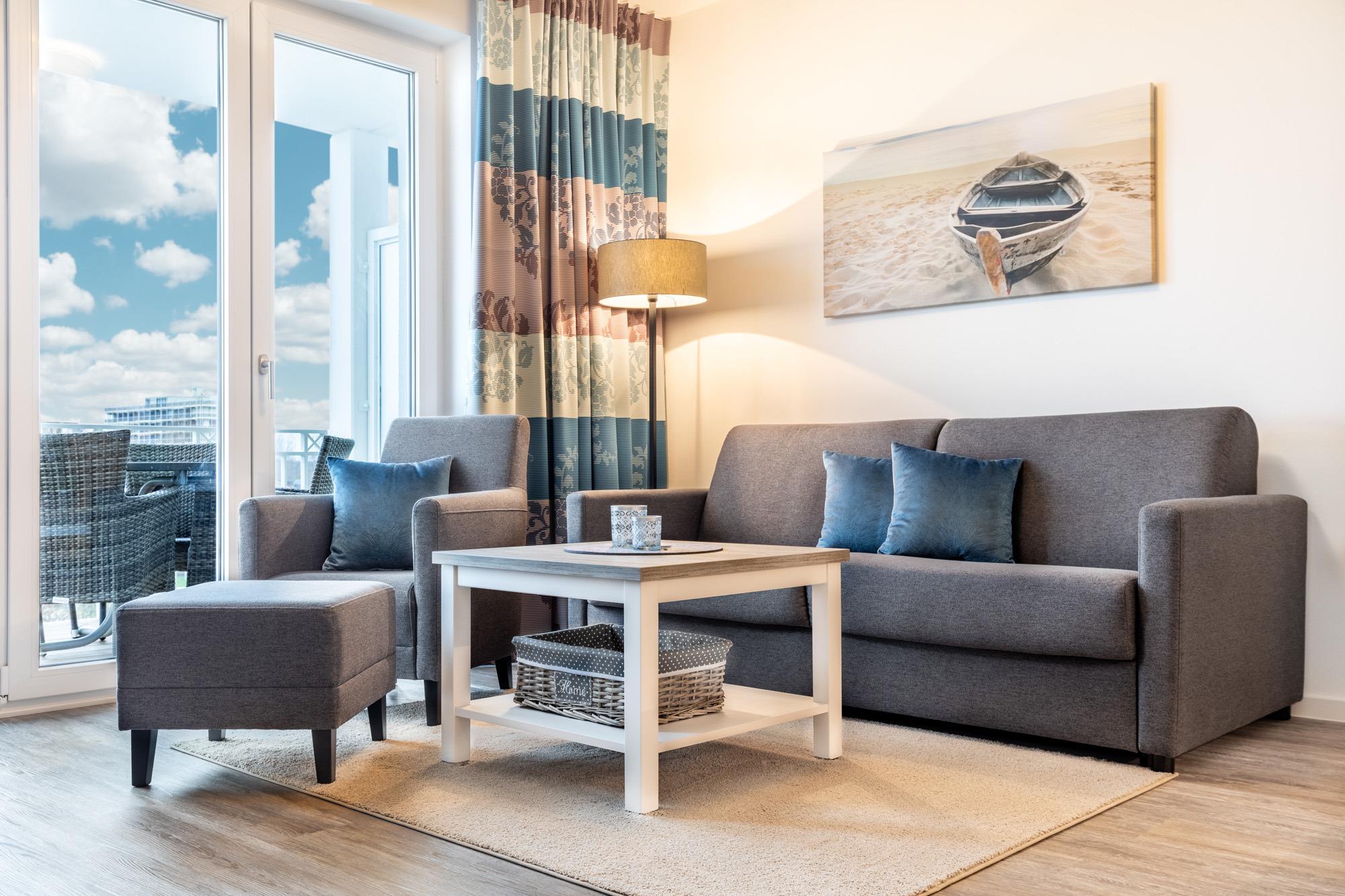 Unsere moderne und komfortable Ferienwohnung für 4 Personen liegt direkt in der 1. Reihe am Strand mit Meerblick! Die 58m2 große Wohnung mit 1 Schlafzimmer und 1 Schlafcouch ist mit einer komplett eingerichteten Küche incl. Geschirrspüler, Fußbodenheizung und sonnenschutzverglasten, bodentiefen Fenstern ausgestattet. Auf dem Südwest Balkon können Sie den traumhaften Blick aufs Meer genießen! Kostenlose Sauna direkt in der Anlage! Abschließbarer Raum für Ihre Fahrräder und e-bikes. Tiefgaragenplatz und Aufzug vorhanden. Kostenlose Nutzung von Waschmaschine und Trockner.