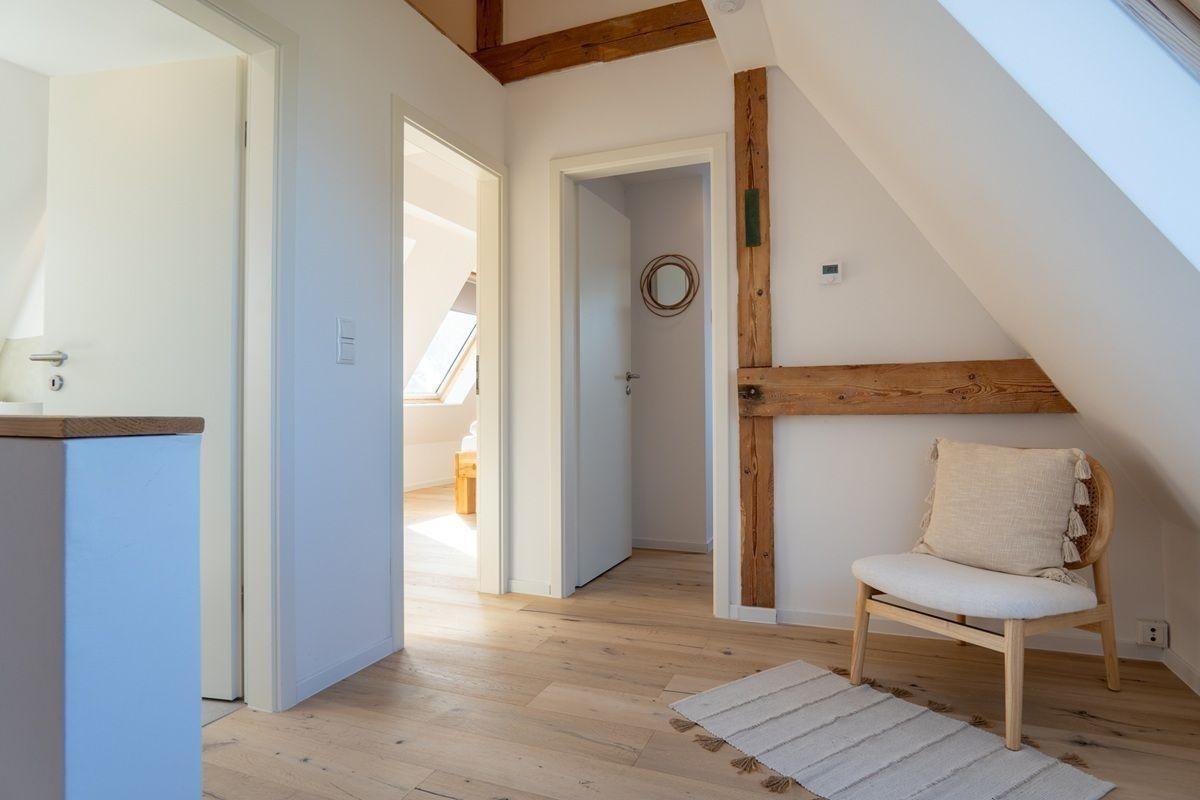 Im Dachgeschoss befinden sich zwei separate Schlafzimmer – beide mit bequemen Doppelbetten ausgestattet – sowie zwei moderne Bäder.