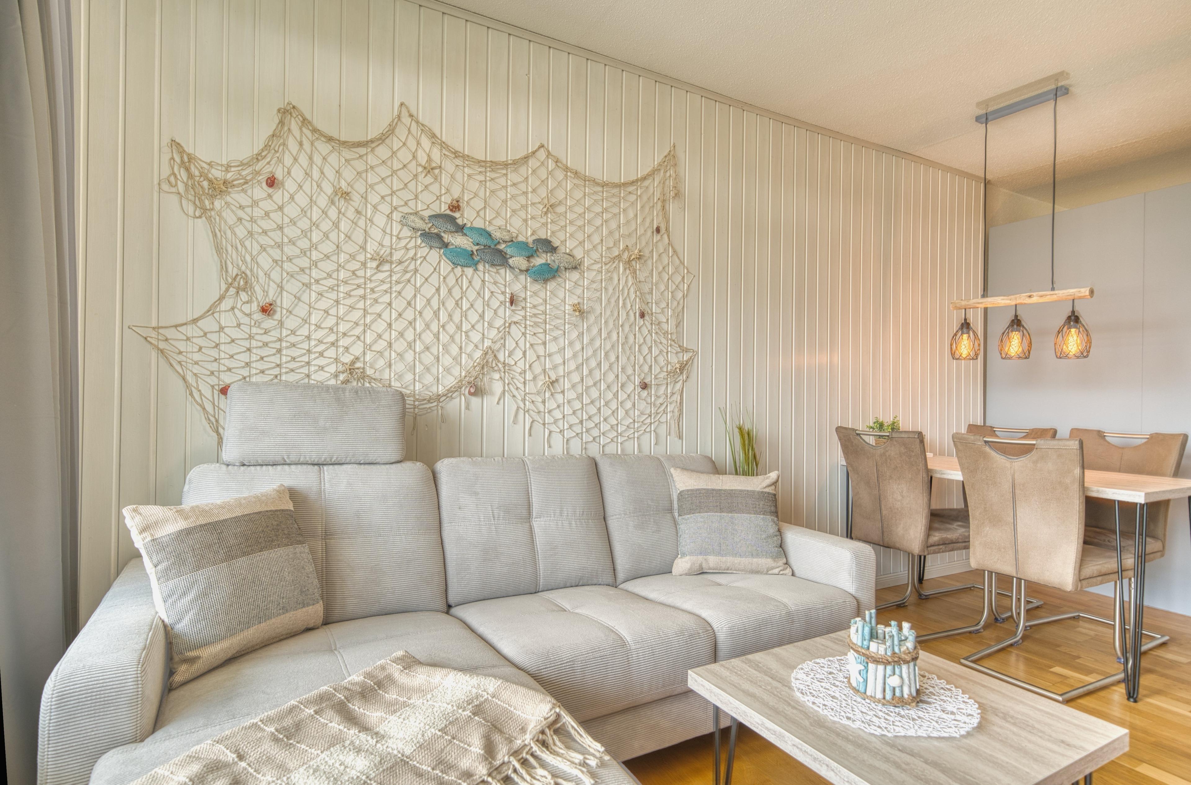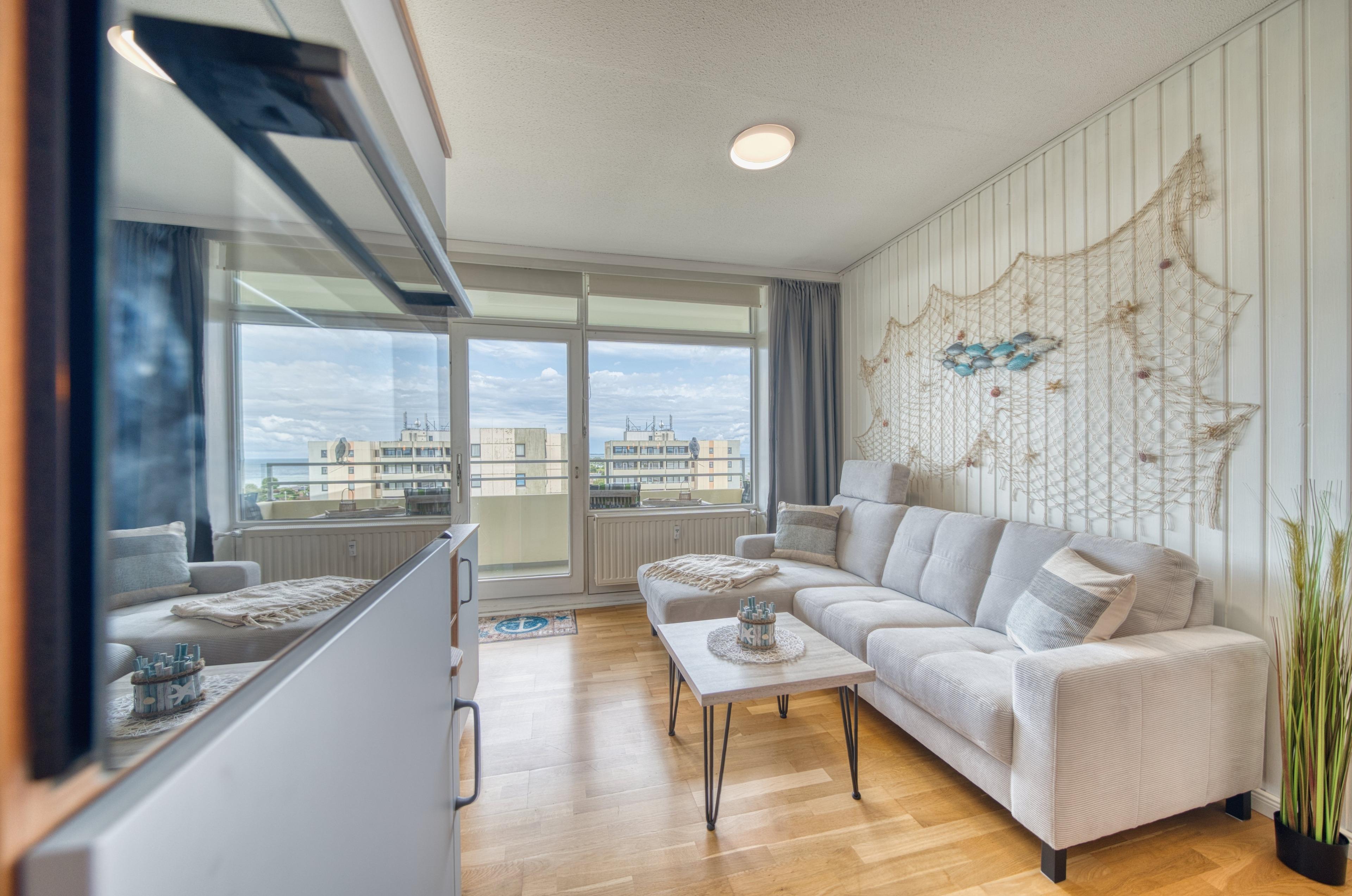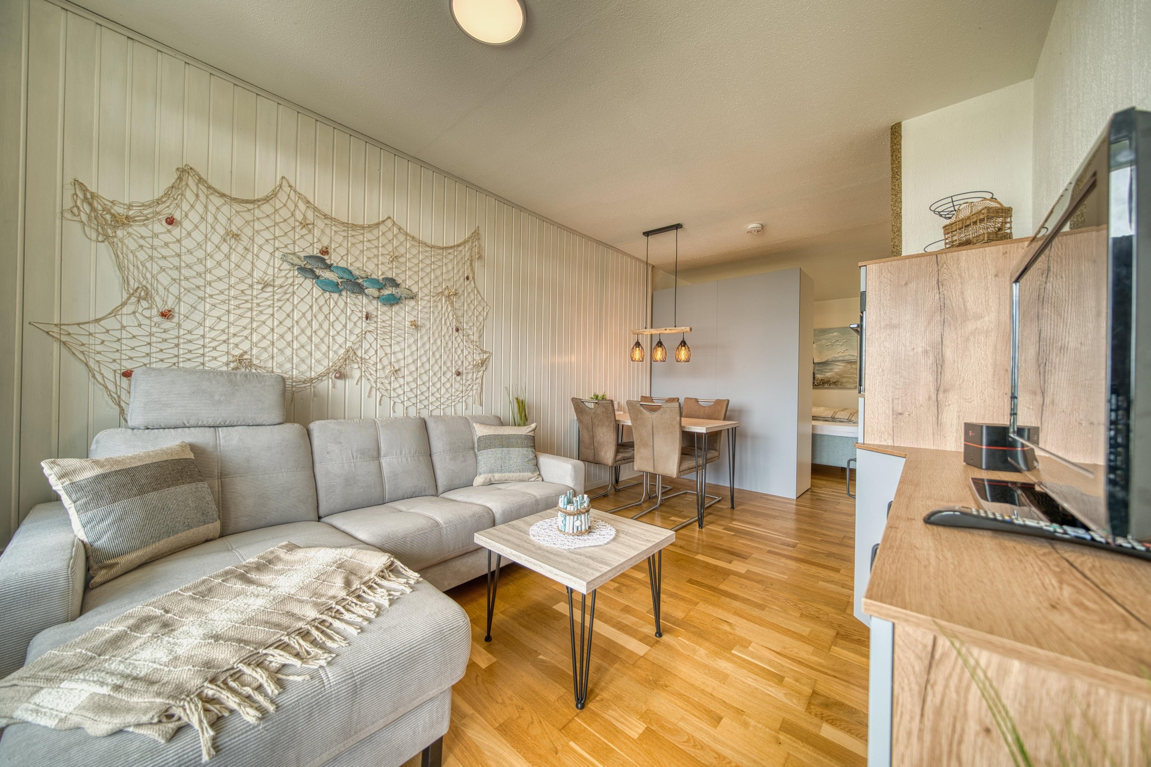 Das Wohnzimmer lädt mit bequemer Couch, stilvoller Einrichtung und viel Tageslicht zum Verweilen ein. Der angrenzende Balkon mit Hängeschaukel und Sitzgelegenheit bietet einen wunderschönen seitlichen Blick auf die Ostsee – ideal für einen entspannten Start in den Tag oder einen Sundowner am Abend.