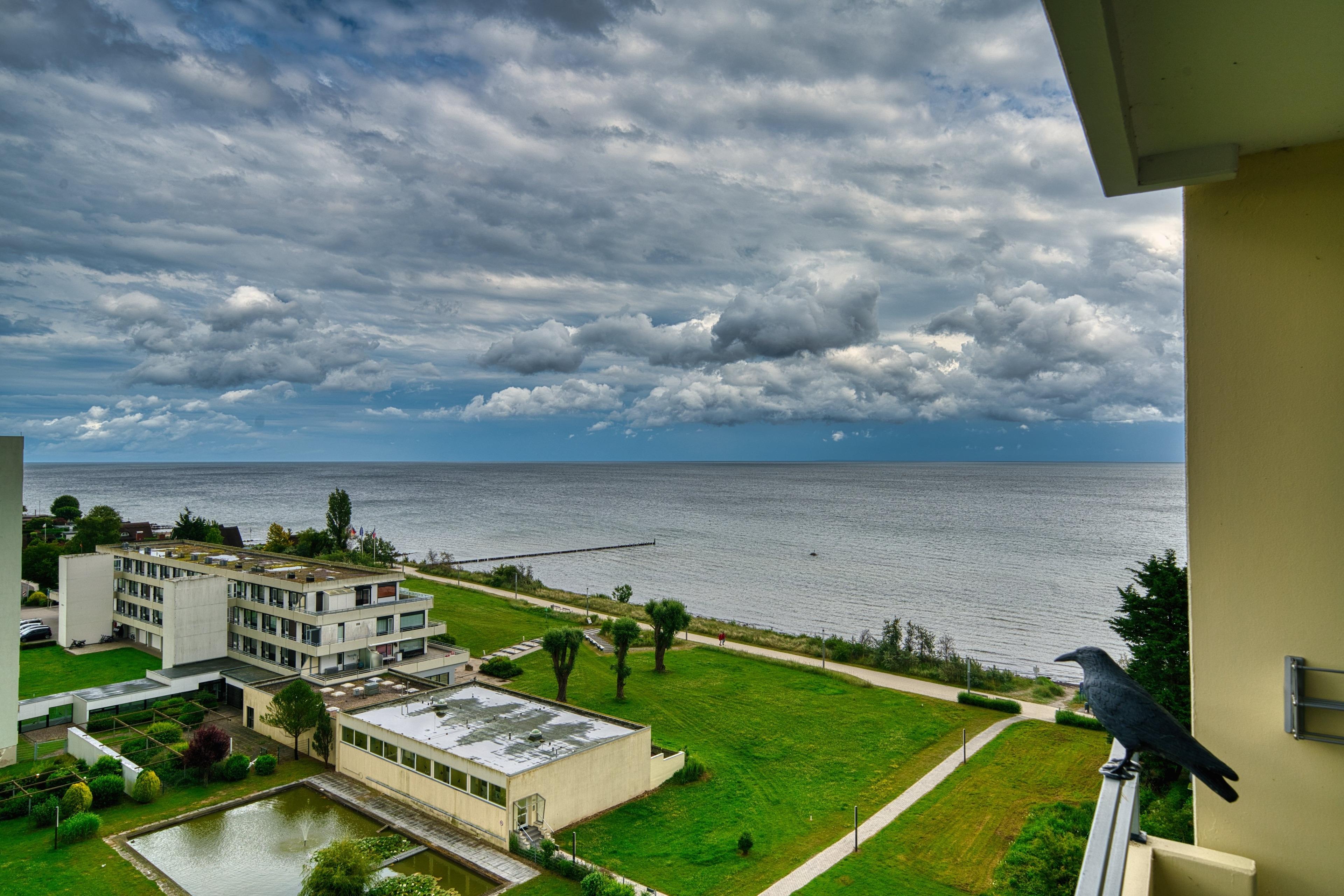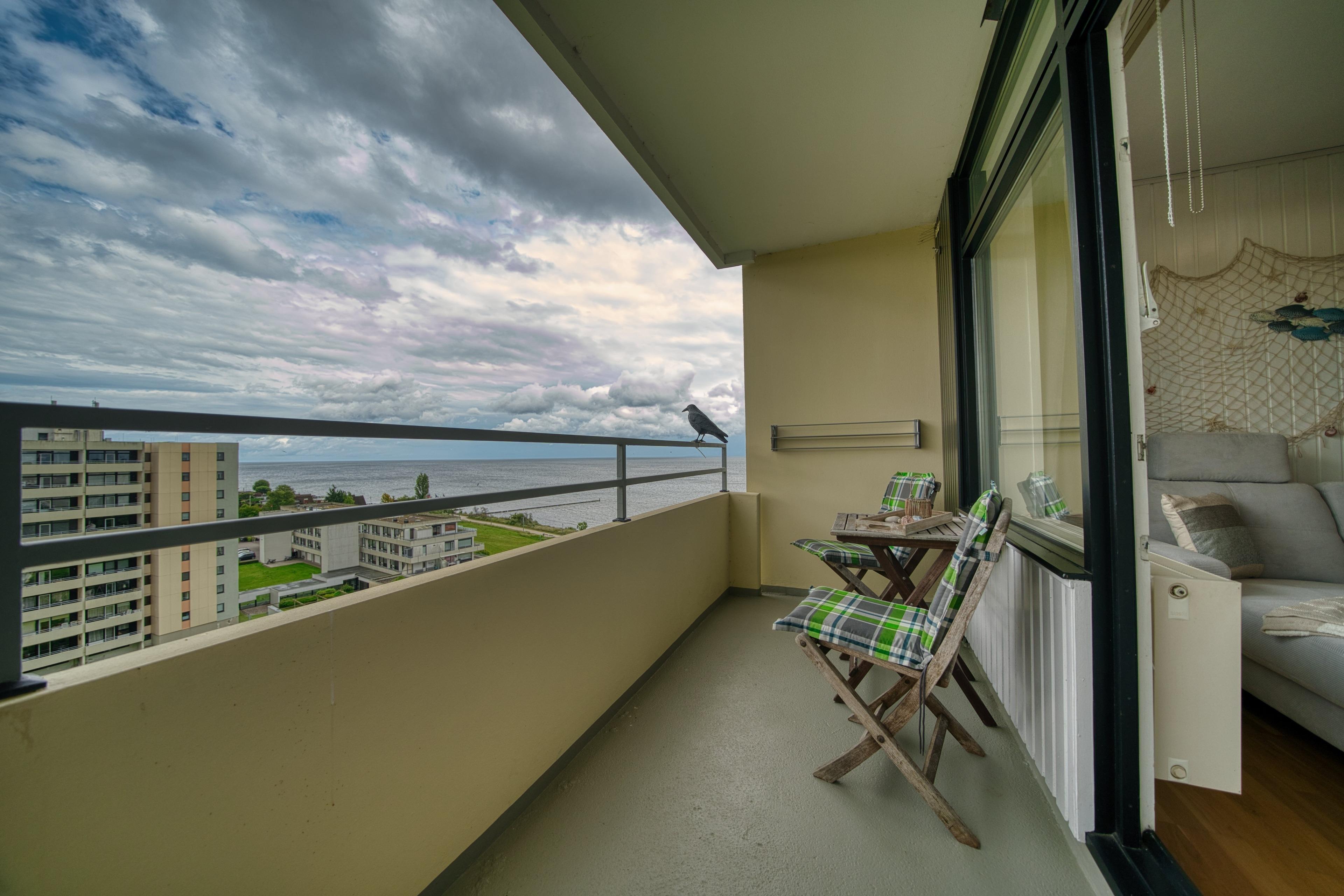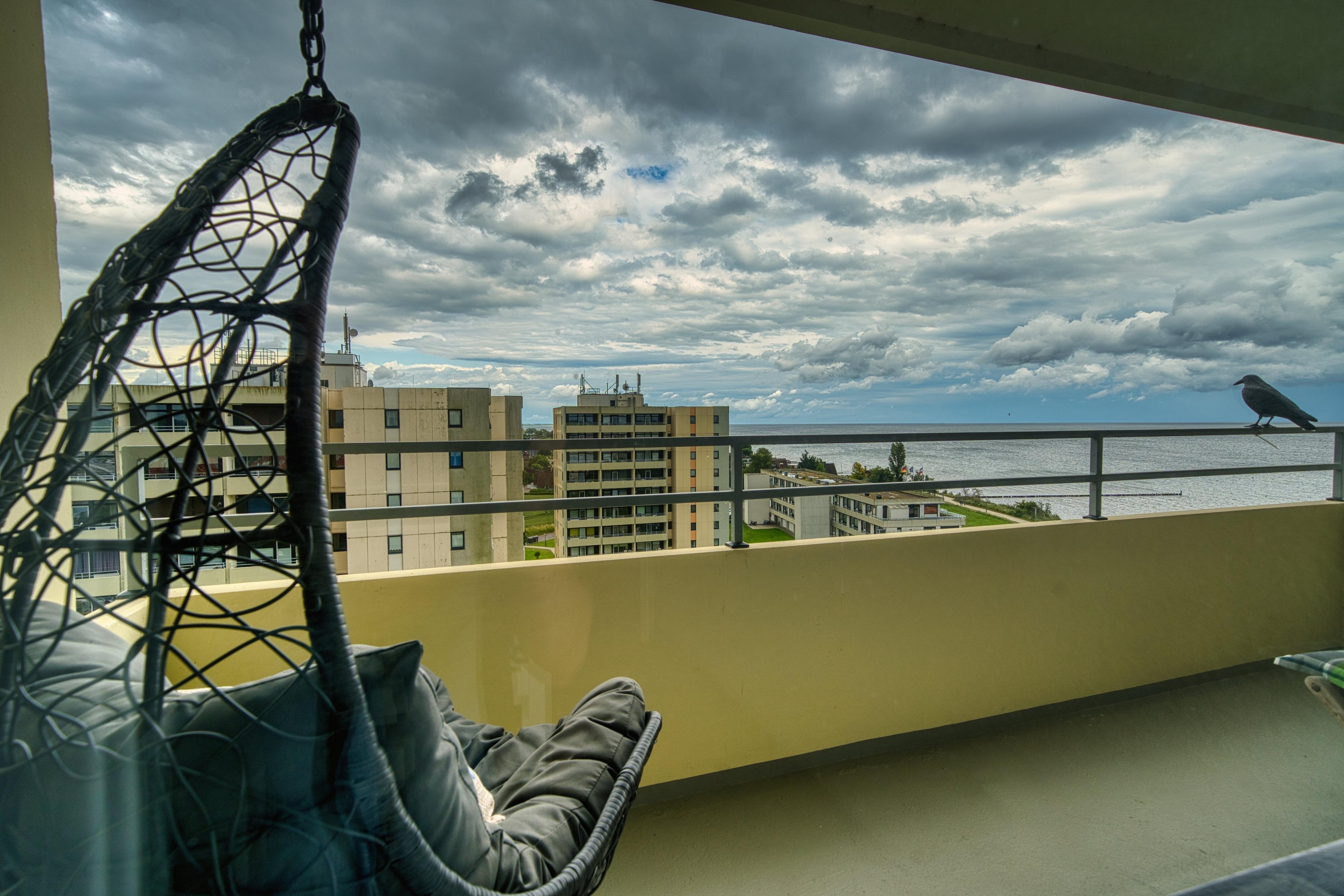 Das Wohnzimmer lädt mit bequemer Couch, stilvoller Einrichtung und viel Tageslicht zum Verweilen ein. Der angrenzende Balkon mit Hängeschaukel und Sitzgelegenheit bietet einen wunderschönen seitlichen Blick auf die Ostsee – ideal für einen entspannten Start in den Tag oder einen Sundowner am Abend.