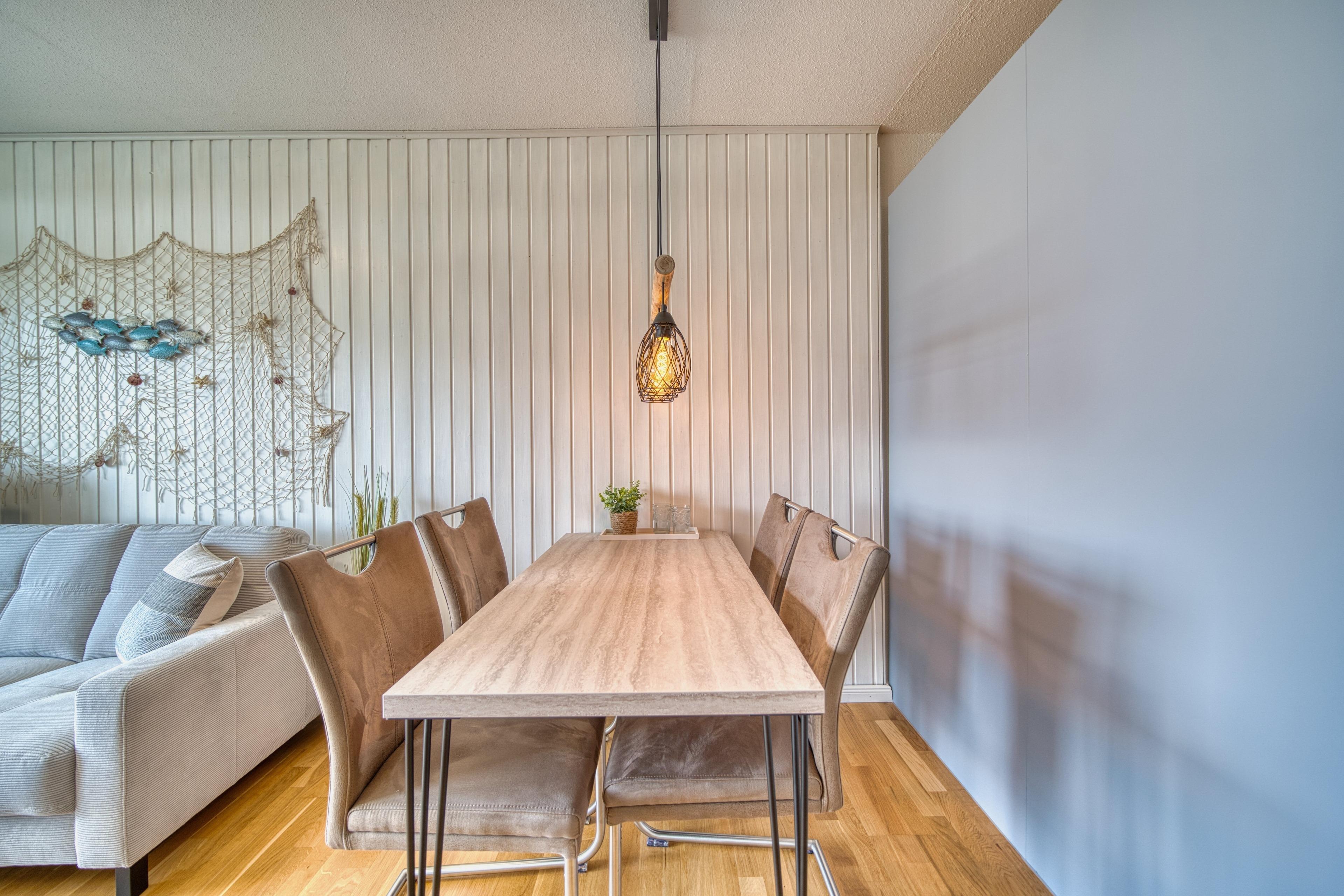 Essen Sie gemeinsam am Esstisch oder genießen Sie Ihre Mahlzeit auf dem Balkon mit frischer Ostseeluft.