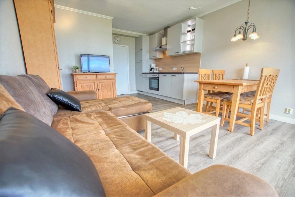 Geräumiges Wohnzimmer mit gemütlicher Essecke und Schlafcouch für 2 Personen
