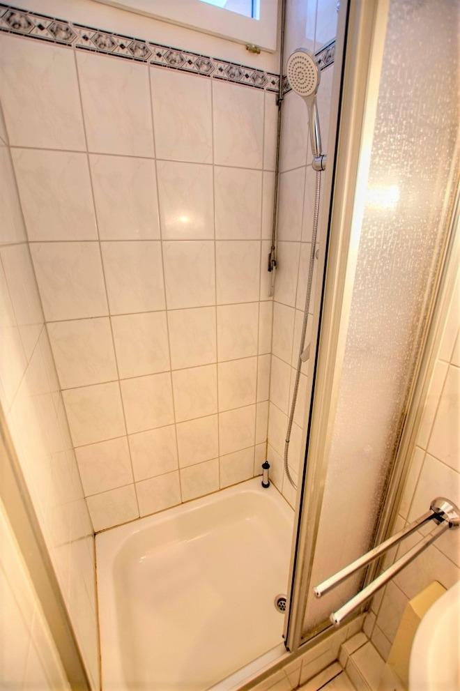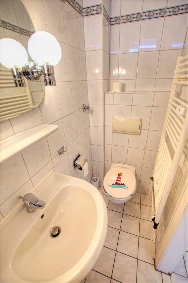 Badezimmer: Gefliest, mit Duschkabine, Handtuchhalter und WC