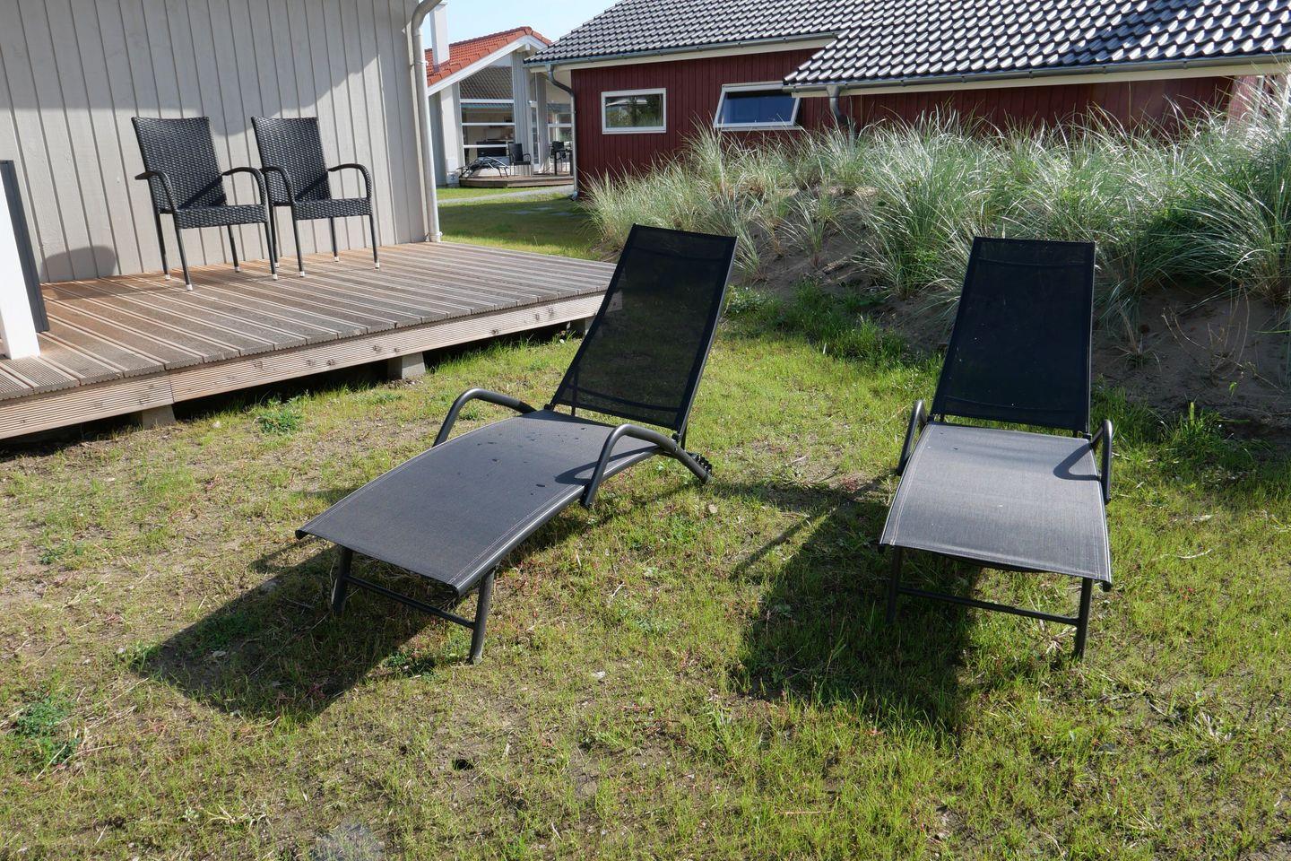 Vom Wohnbereich aus haben Sie Zugang zur teils überdachten, mit Gartentisch und Stühlen möblierten Terrasse, auf der Sie die langen Sommerabende genießen können. 2 Sonnenliegen stehen Ihnen ebenfalls zur freien Verfügung.