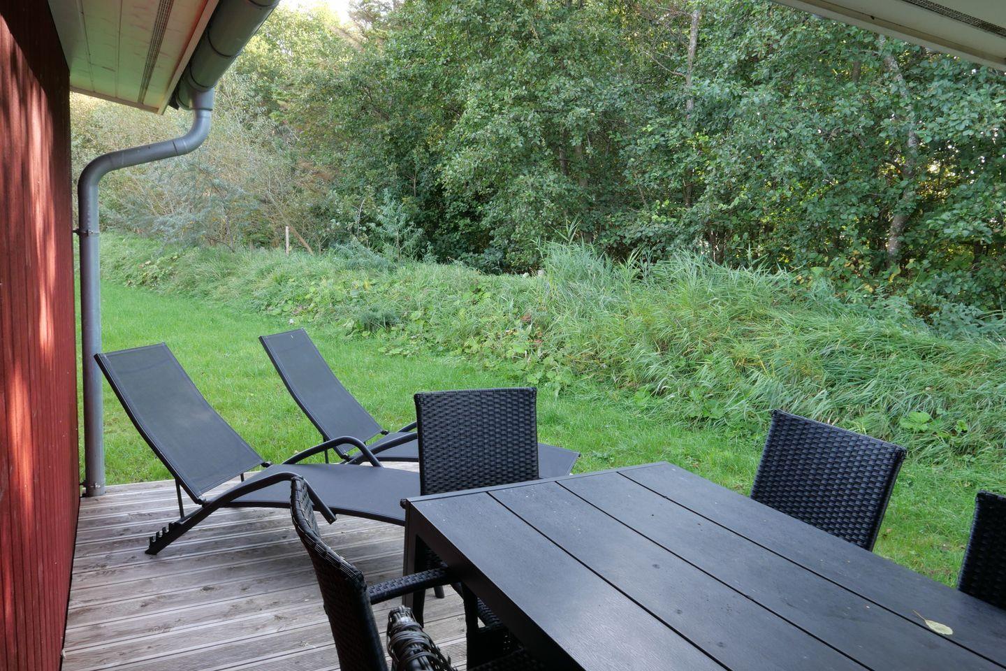 Vom Wohnbereich aus haben Sie Zugang zur teils überdachten, mit Gartentisch und Stühlen möblierten Terrasse, auf der Sie die langen Sommerabende genießen können. 2 Sonnenliegen stehen Ihnen ebenfalls zur freien Verfügung.
