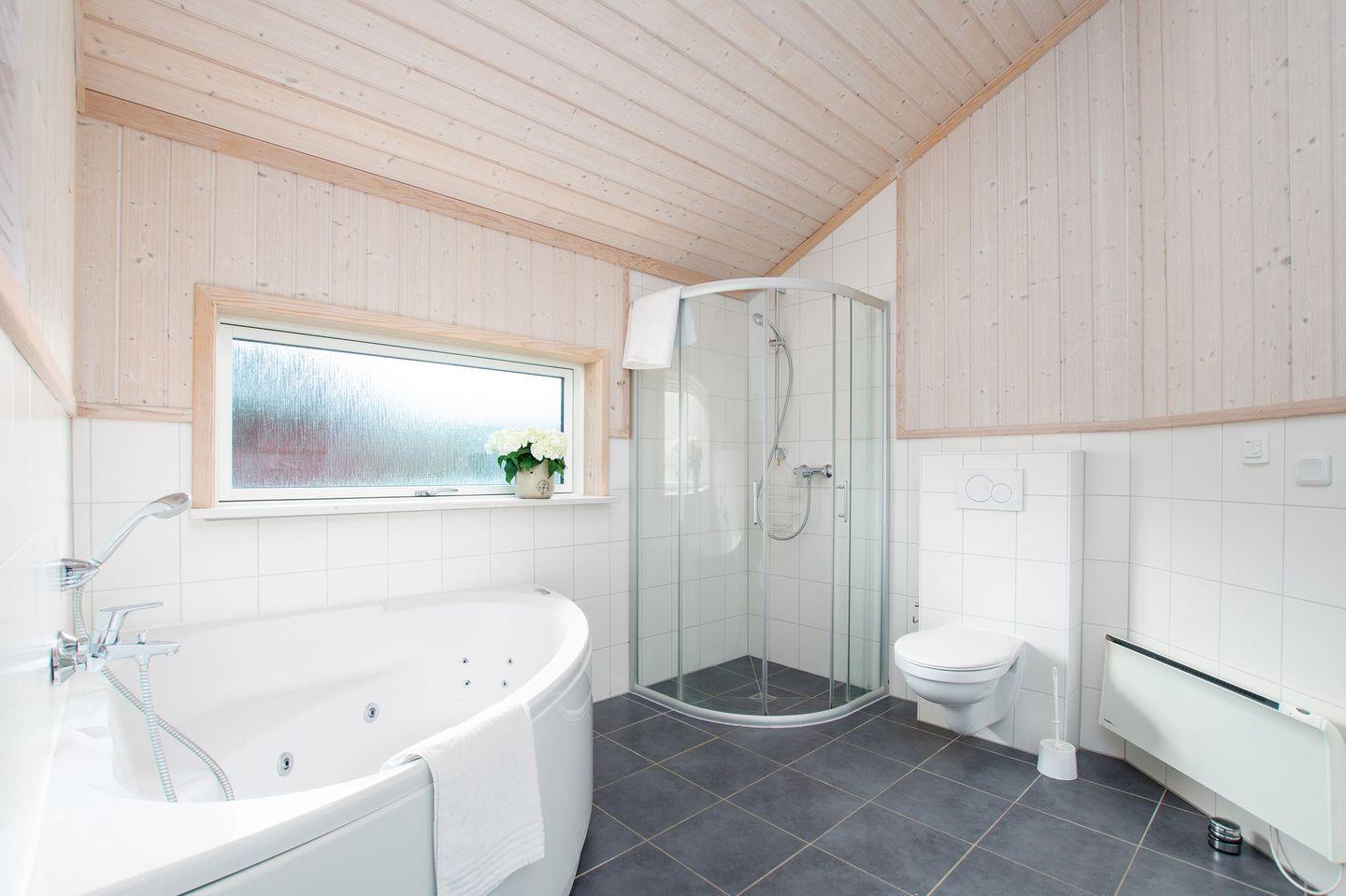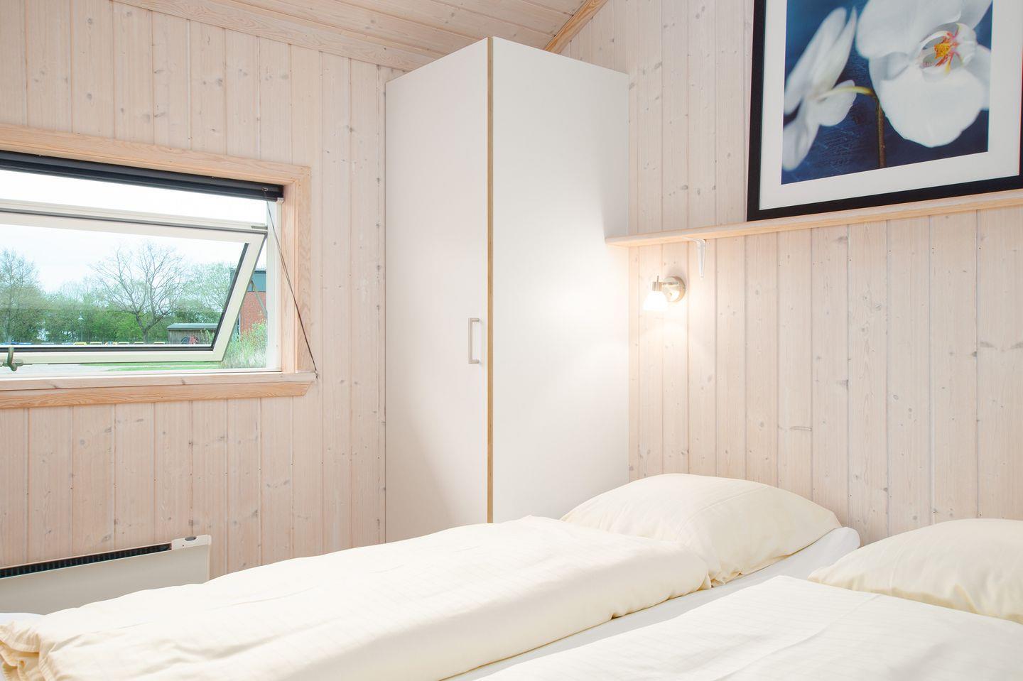 Die zwei Bereiche mit insgesamt 4 Schlafzimmern sind räumlich voneinander getrennt und auf gegenüberliegenden Seiten des Hauses platziert. Jeder Schlafbereich beinhaltet jeweils ein Schlafzimmer mit Doppelbett und ein Schlafzimmer mit zwei Einzelbetten. Über einem der Schlafbereiche gibt es zwei extra Schlafplätze auf dem Hems, eine Art Schlafboden. Hier tummeln gerne die Kinder. Zu beiden Schlafbereichen gehört jeweils ein Bad. Das große Badezimmer ist mit Whirlpool, Sauna und Dusche ausgestattet und das kleinere Bad mit Dusche. Ein Kinderbett und ein Kinderhochstuhl befinden sich im Haus.