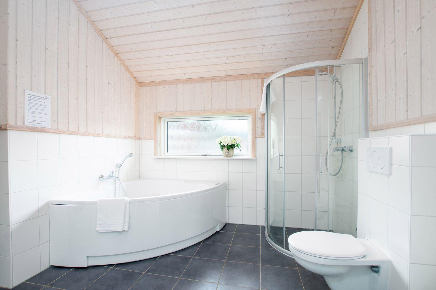 Die zwei Bereiche mit insgesamt 4 Schlafzimmern sind räumlich voneinander getrennt und auf gegenüberliegenden Seiten des Hauses platziert. Jeder Schlafbereich beinhaltet jeweils ein Schlafzimmer mit Doppelbett und ein Schlafzimmer mit zwei Einzelbetten. Über einem der Schlafbereiche gibt es zwei extra Schlafplätze auf dem Hems, eine Art Schlafboden. Hier tummeln gerne die Kinder. Zu beiden Schlafbereichen gehört jeweils ein Bad. Das große Badezimmer ist mit Whirlpool, Sauna und Dusche ausgestattet und das kleinere Bad mit Dusche. Ein Kinderbett und ein Kinderhochstuhl befinden sich im Haus.