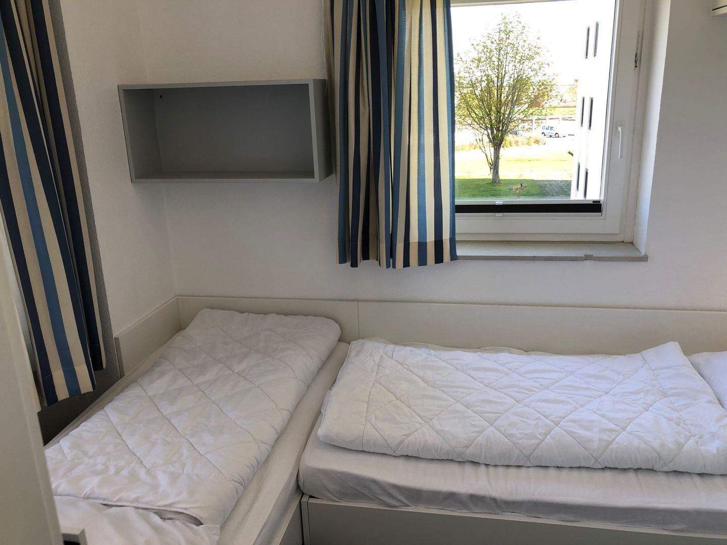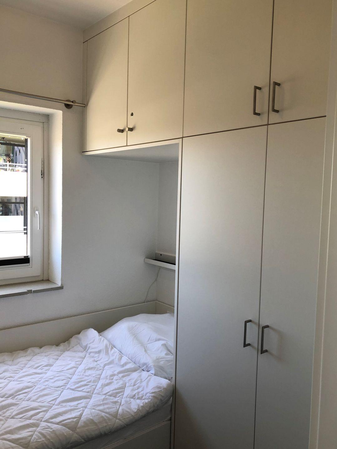 Im hellen, 2021 renovierten Schlafzimmer stehen Ihnen zwei Einzelbetten (80*190 cm & 90*190 cm) über Eck sowie ein Einbau-Kleiderschrank zur Verfügung. Durch die Eck-Lage der Wohnung bietet das Schlafzimmer gleich 2 große Fenster welche mit Verdunklungsvorhängen, Außenjalousie und Plissee ausgestattet sind. Die modernen Leselampen an den Betthäuptern sind in verschiedenen Helligkeiten einstellbar.