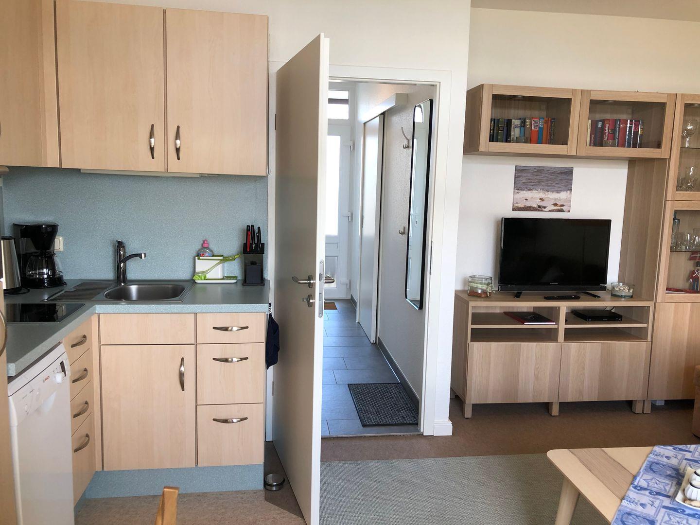 Die kleine Einbauküche im Wohnbereich ist mit Kühlschrank, Spülmaschine, Backofen, Mikrowelle, Kaffeemaschine, Wasserkocher, Toaster, Eierkocher, Mixer und Stabmixer umfassend auch für einen längeren Aufenthalt ausgestattet.