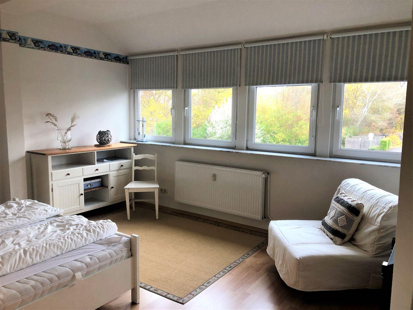 Das separate, zweite Schlafzimmer bietet ebenfalls einen seitlichen Blick aufs Meer und ein großes Doppelbett (Bettmaß 1,80*200 cm = 2*90 cm), sowie einen Sessel (80 cm breit, Liegefläche besteht aus drei Matratzenteilen), welcher als zusätzliche Schlafmöglichkeit aufgeklappt werden kann. Hier haben Kinder richtig viel Platz zum Spielen, sodass auch regnerische Tage hier ordentlich Spaß machen können.