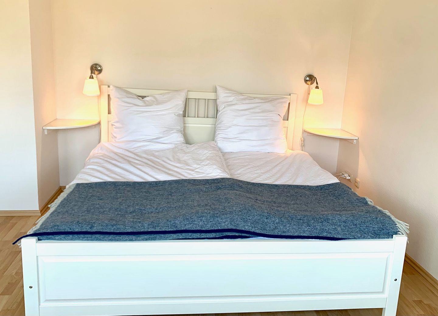 Im ersten Zimmer, welches auch als Übergang zu dem weiteren Schlafzimmer dient, befindet sich ein Doppelbett (Bettmaß 160*200 cm = 2*80 cm) sowie ein Arbeitsbereich, welcher alle Ansprüche an ein modernes Homeoffice erfüllt.