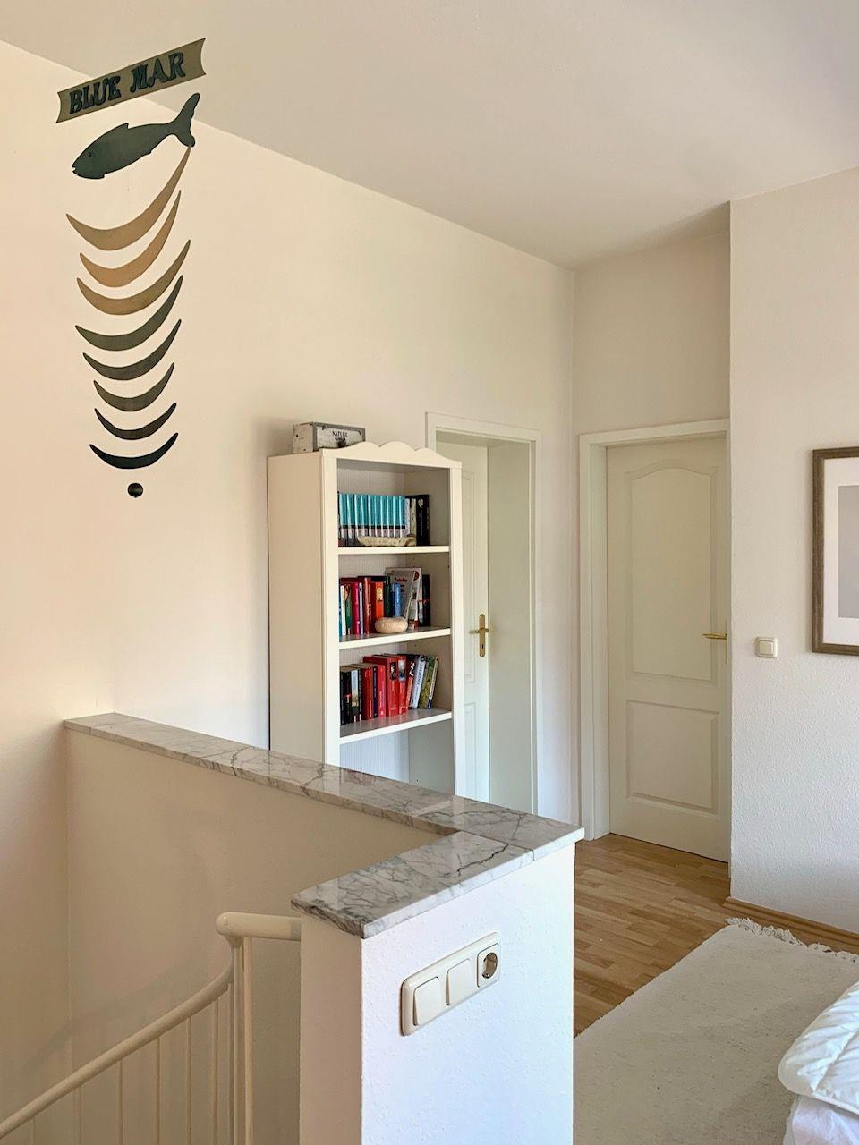 Über die Treppe im Wohnraum gelangen Sie in das helle Obergeschoss, in welchem Sie aus allen Fenstern einen herrlichen seitlichen Meerblick haben.