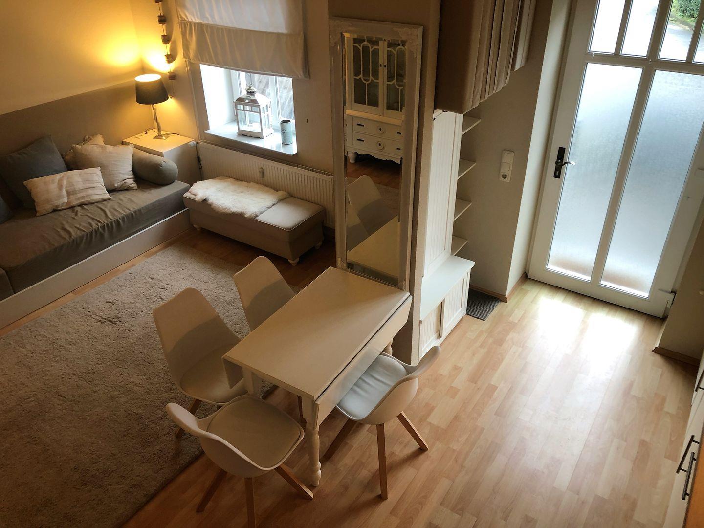 Im Erdgeschoss befindet sich das gemütliche Wohnzimmer - das Herzstück dieser Wohlfühlwohnung. Das maßgefertigte Sofa bietet der ganzen Familie Platz und lädt am Elektro-Ofen zu gemütlichen Stunden in kuscheliger Atmosphäre ein. WLAN, Smart-TV und Blu-ray-Player und eine hochwertige Bluetooth-Box stehen zu Ihrer Unterhaltung zur Verfügung.